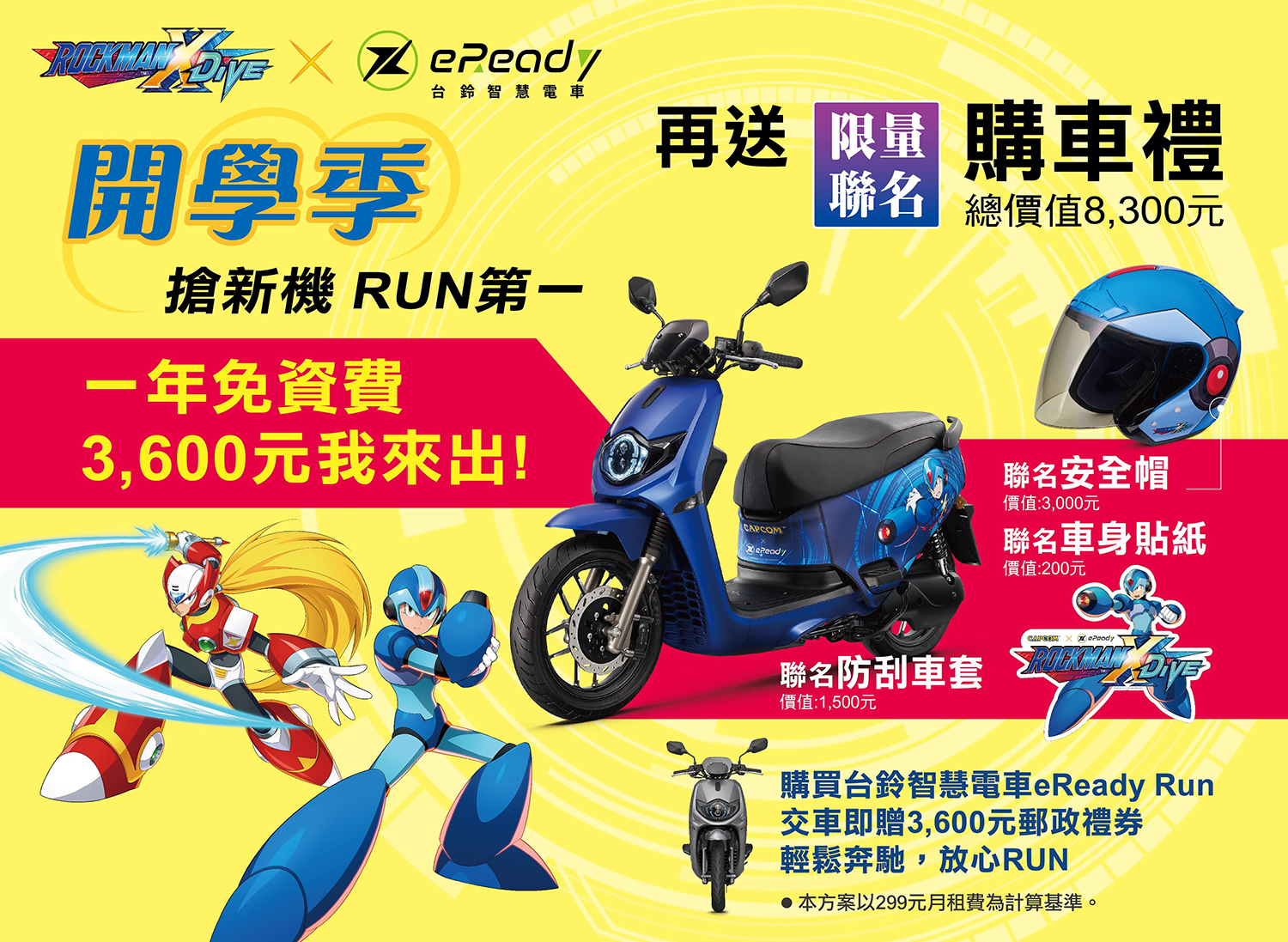 即日起至10/31,購買eReady Run即贈限量聯名購車禮,總價值高達8,300元,包含《ROCKMAN XDiVE》聯名安全帽、聯名車身貼紙、聯名防刮車套以及3,600元郵政禮券,等於直接幫學生族預繳一年電池資費,快趁開學季搶新機RUN第一!
