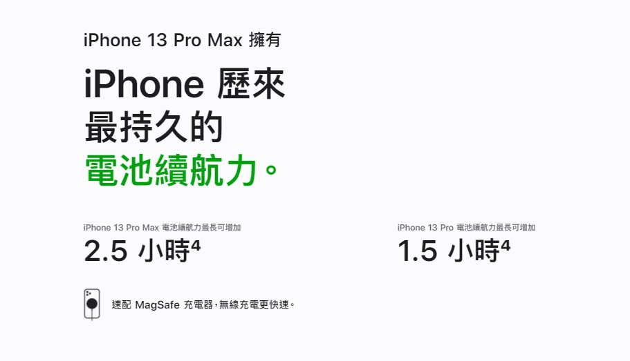 電池續航力比其前一代也有所提升,iPhone 13 Pro續航力提升1.5小時,iPhone 13 Pro Max則是提升2.5小時續航力;APPLE台灣官網上也預告iPhone 13 Pro/MAX系列同樣會在9月17日晚上8點展開預購,並在9月24日開始發售。