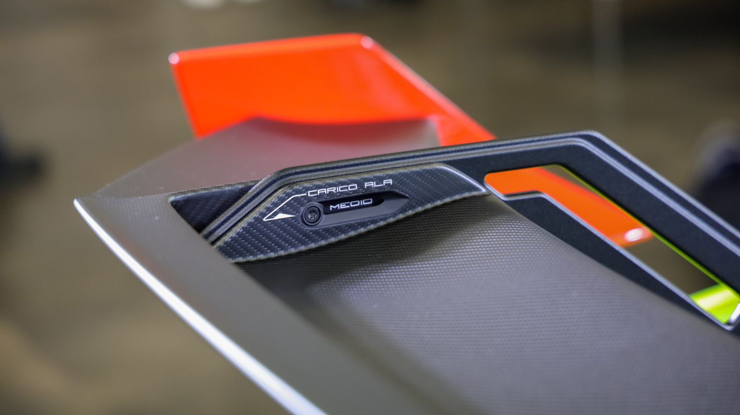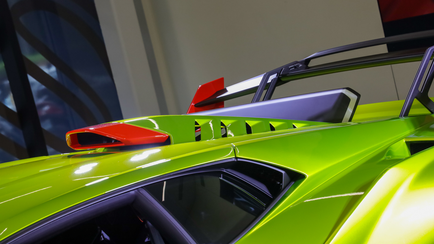 車尾設計絕佳詮釋無懈可擊的空氣動力系統。取於Super Trofeo EVO的新型後葉子板,在減少迎風面積並降低風阻的同時,提升尾部下壓力,增進車輛整體空力效益;位於葉子板上的NACA進氣口,以更短的進氣通道為引擎室導入氣流。重新設計的引擎蓋整合車頂進氣口,提升引擎冷卻效力,車頂進氣口造型往車尾延伸,形成彷若鯊魚鰭的中央背鰭設計,有助於提升車輛高速行駛及進彎時的穩定性,進一步優化整體動態性能。可調節式尾翼,可依據不同駕駛條件進行三段調整,以達到最合適的空力平衡狀態。
