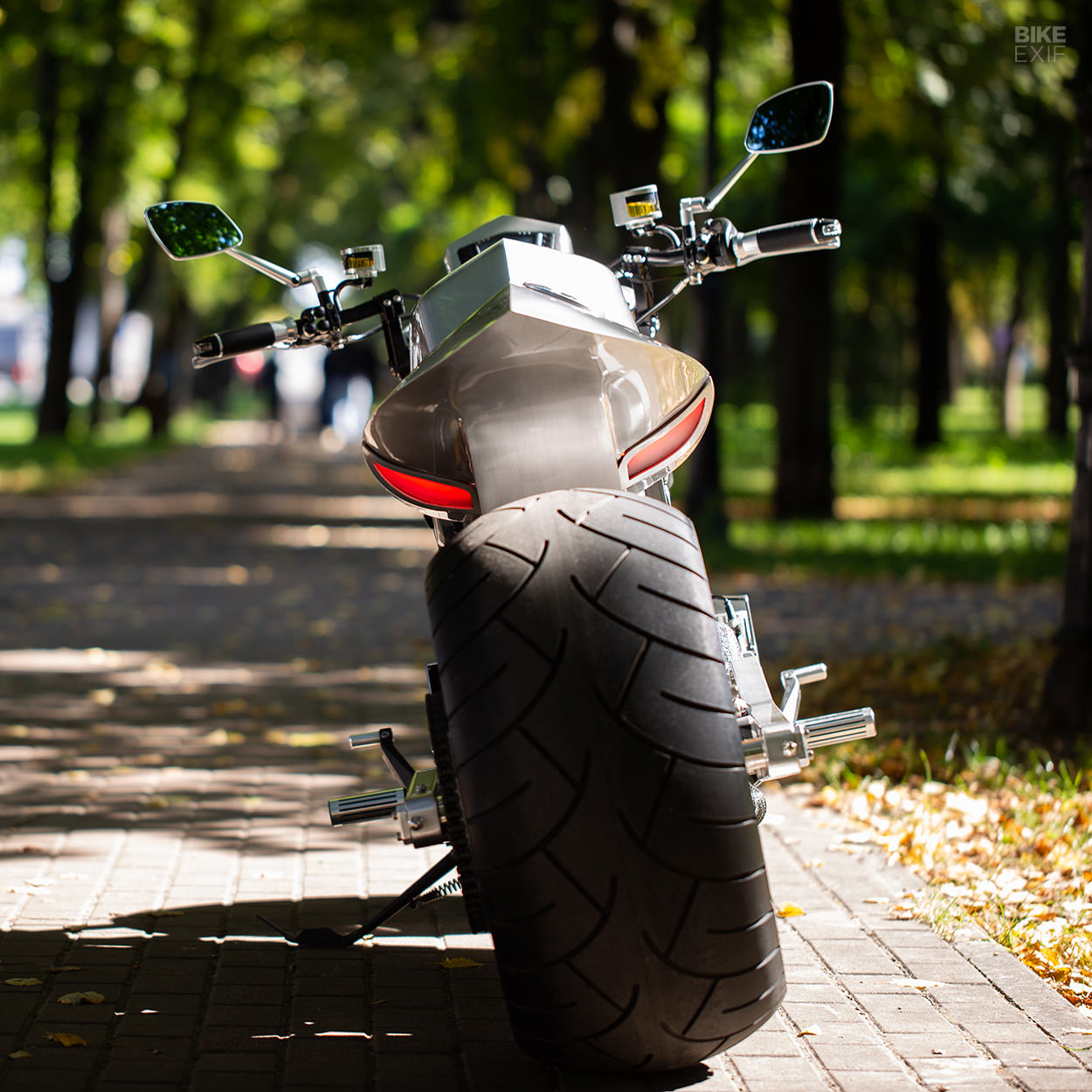 鋁合金油箱外蓋並非油箱本體,油箱本體位在車體尾部與駕駛座墊後方,同時整合了後燈組與披覆鴕鳥皮座墊,在金屬與皮革之間做出了強烈的對比。