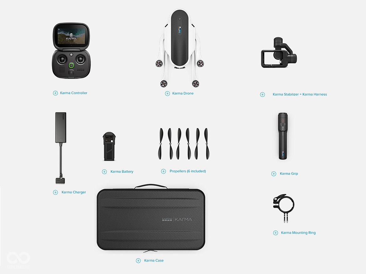 Karma內亦有寫入各國禁航區,避免誤闖造成危險,無人機也有防丟失設計,當電量過低或發生斷訊時將會自動返航,Karma除了完全支援新款的Hero5之外,也向下相容,部分支援Hero4 Black和Hero4 Silver。