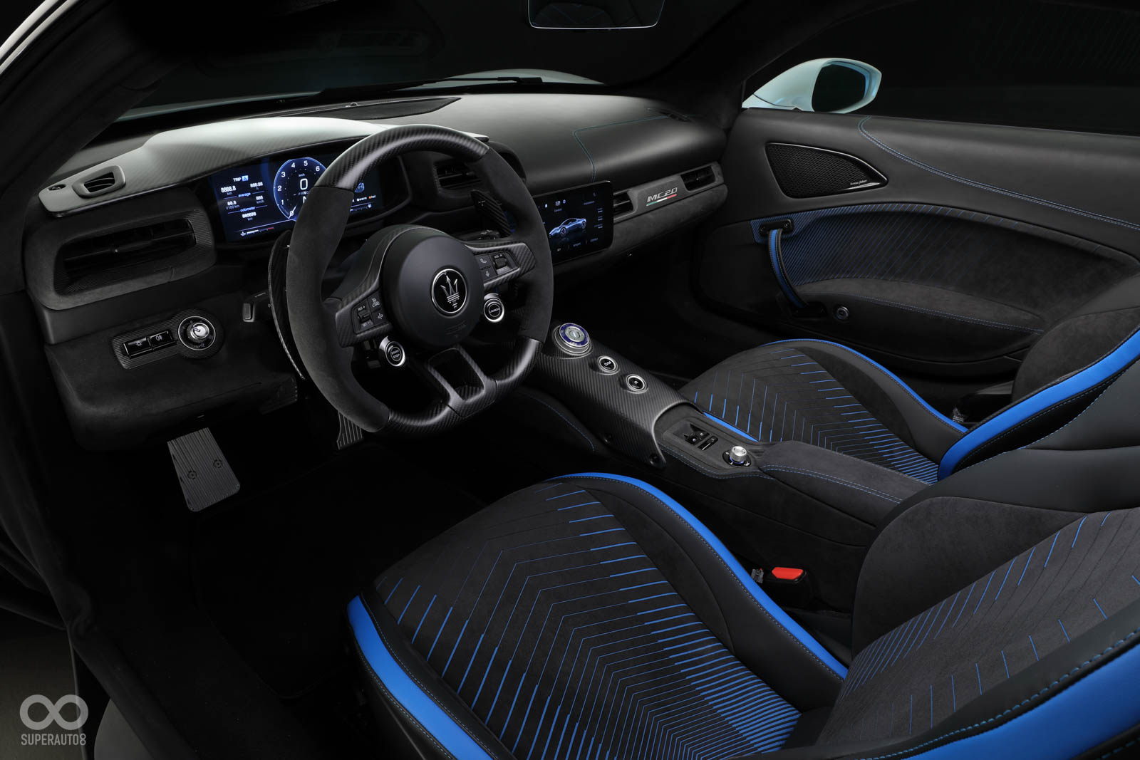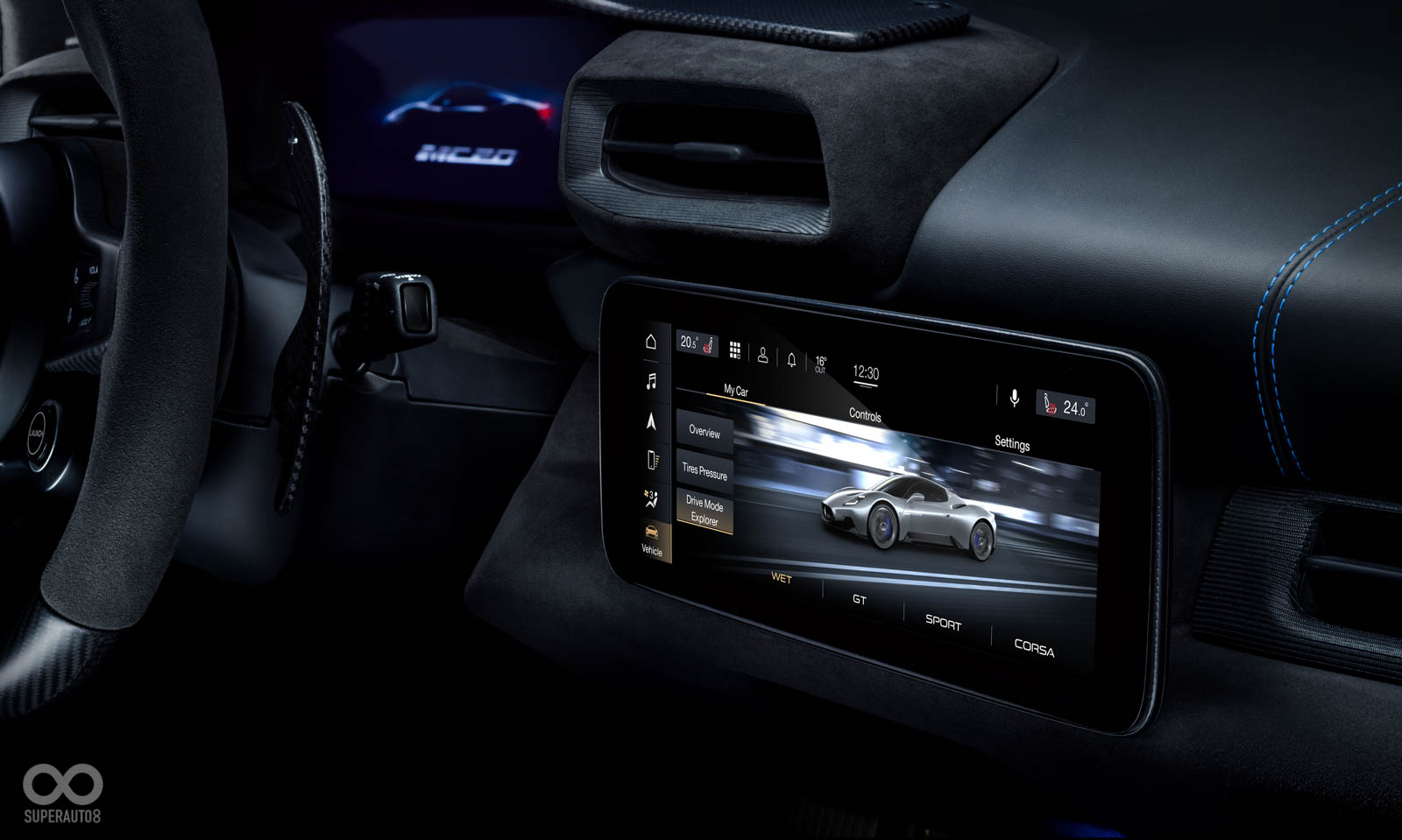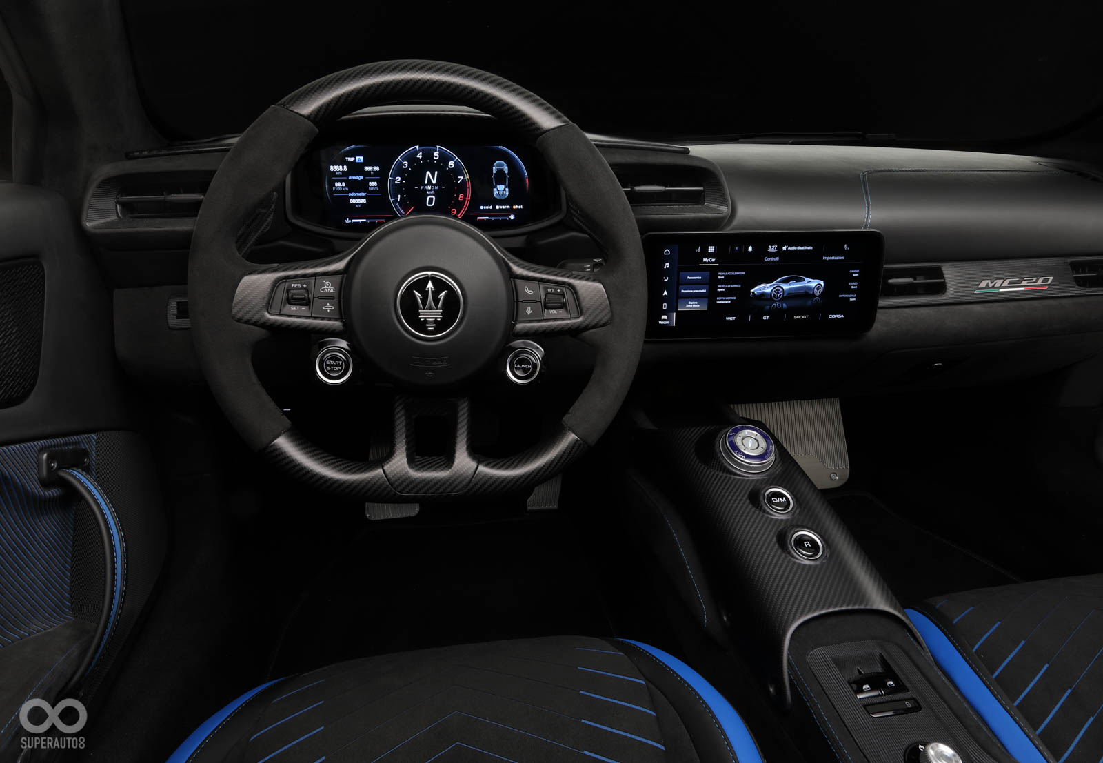 MC20在內裝部分採用極具戰鬥氛圍的駕駛導向設計,由消光碳纖維、黑色麂皮和頂級皮革構築而成:碳纖維三幅式多功能競技方向盤整合引擎點火按鈕及獨立的彈射起步按鈕,並配備Maserati經典的大型固定式換檔撥片;中央鞍座以消光碳纖維包覆,僅呈現駕馭車輛時最需要的重要功能按鈕,其中包含全新設計的駕駛模式旋鈕,讓駕駛人可於「GT」道路模式、「Sport」運動模式、「Corsa」賽道模式 (支援彈射起步)、「Wet」濕滑路面模式、以及「ESC-Off」等多種模式中進行選擇,一坐進車室並能全神貫注於極限操駕之中。