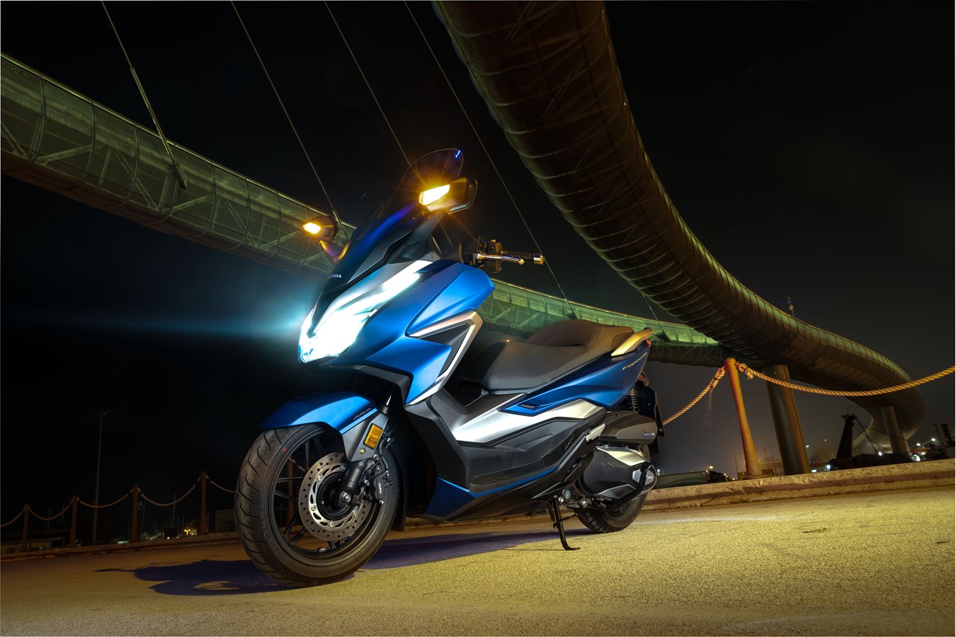 車架部分也和FORZA350相同,但軸距增長來到1520mm,車重也增加到185公斤和188公斤,尺寸和車重的增加應該是為了強化跨界越野性所帶來的改變,另外兩個不同的車重版本則有可能是配備部分的差異;另外車身的長、寬、高也和FORZA350不同,長度可能是輪胎尺寸帶來的差異,寬度則明顯是換上更寬的握把,而高度變化是風鏡設計不同造成的。