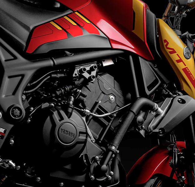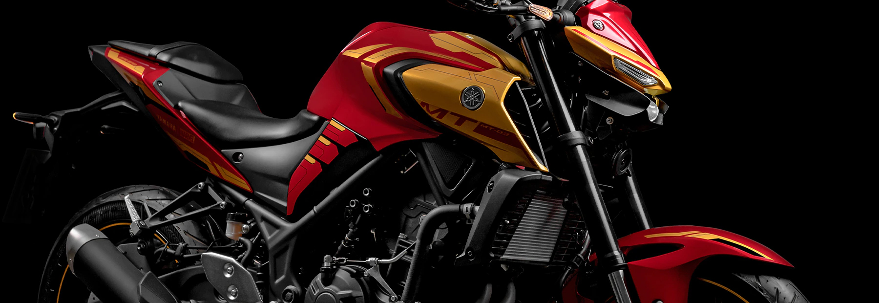 以鋼鐵人為名的MT-03特仕版,車身塗裝理所當然的披覆著鋼鐵人標誌性的金、紅兩色,同時,憑藉著新型家族化的光條形定位燈與圓形LED大燈,MT-03特仕版完美呼應了鋼鐵人的銳利雙眼與胸前方舟反應爐。