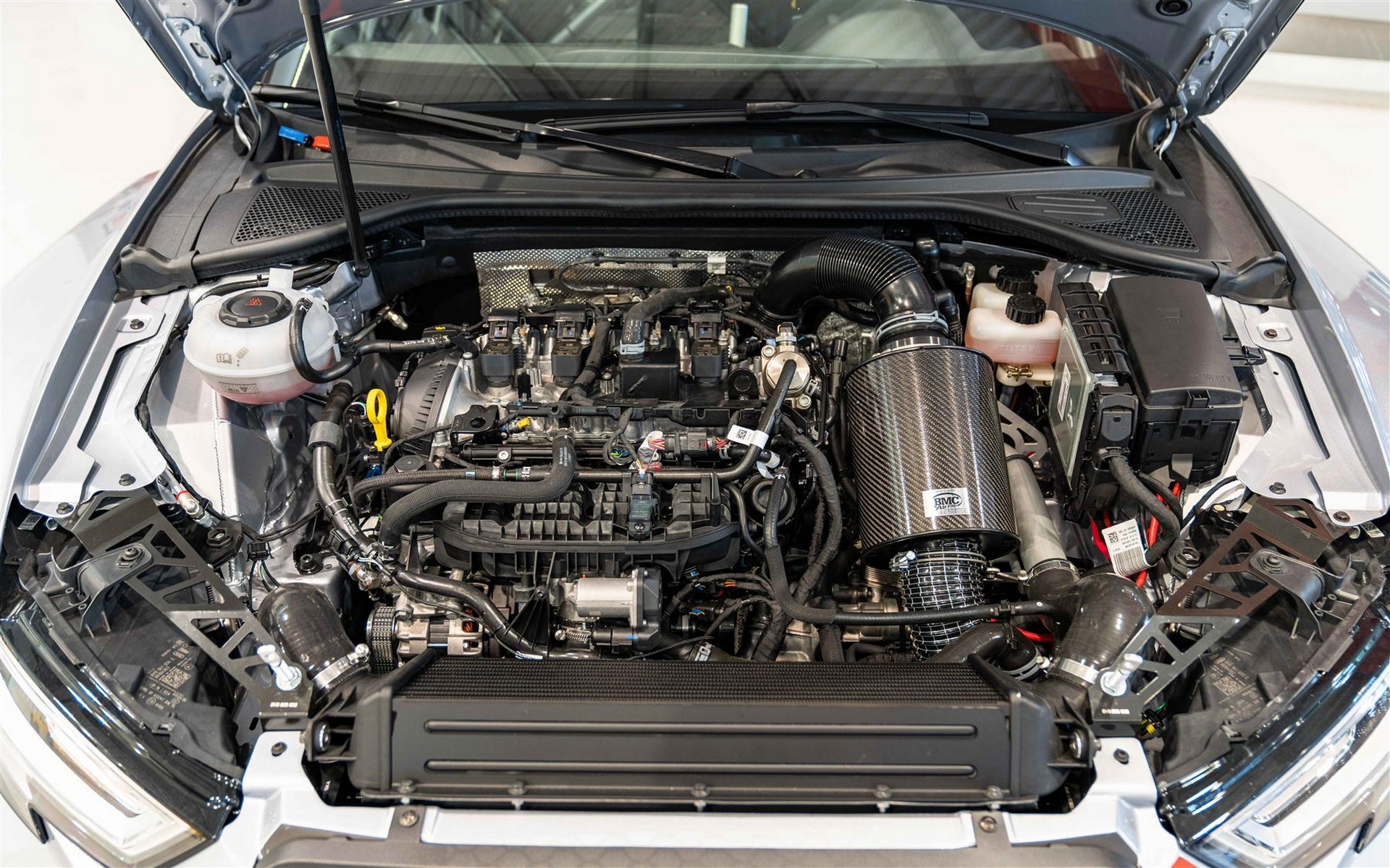 在一般道路版本的RS3上面搭配的是他們引以為傲的直列五缸引擎以及quattro四驅系統,但這在RS3 TCR上面全都沒有,為了符合賽事規範搭載的是直列四缸渦輪增壓引擎,配置DSG雙離合器變速將動力全數送至前輪,而最大輸出則是控制在340hp/58kg-m,這比一般RS3的395hp還要更弱,不過這就是比賽規則,同時車輛還配有六活塞煞車卡鉗以及三個氣動千斤頂。