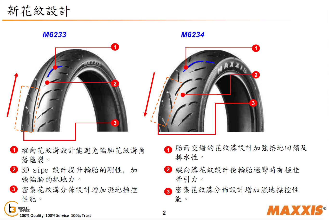 除了MA-ST2 MAXXIS同時也發表了另一款針對黃牌輕檔車所設計的胎款EXTRAMAXX M6233、M6234,黃牌檔車如R3、忍300、SB300等車款大多用於通勤,與競賽取向需求不同,通勤胎需要在磨耗與性能間取得平衡,更要著重於雨天排水性和抓地力,以保障騎士安全。