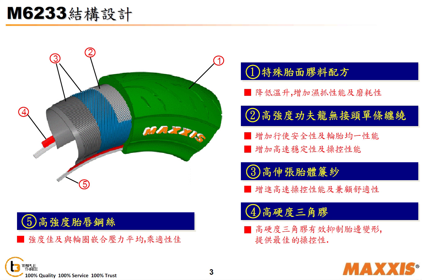 M6233主要用於前輪,膠料針對濕滑路面所設計,面對雨天能保有最佳抓地力,胎體外層披覆功夫龍材質,能有效提升高速穩定性,內層主要使用鋼張力簾紗編織,胎唇則用高強度鋼絲並且以較硬的三角膠強化,兩種材質交編,穩定與舒適性兼顧。