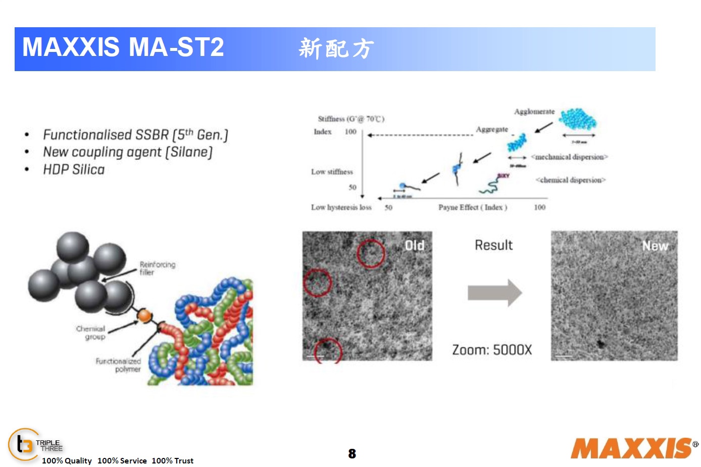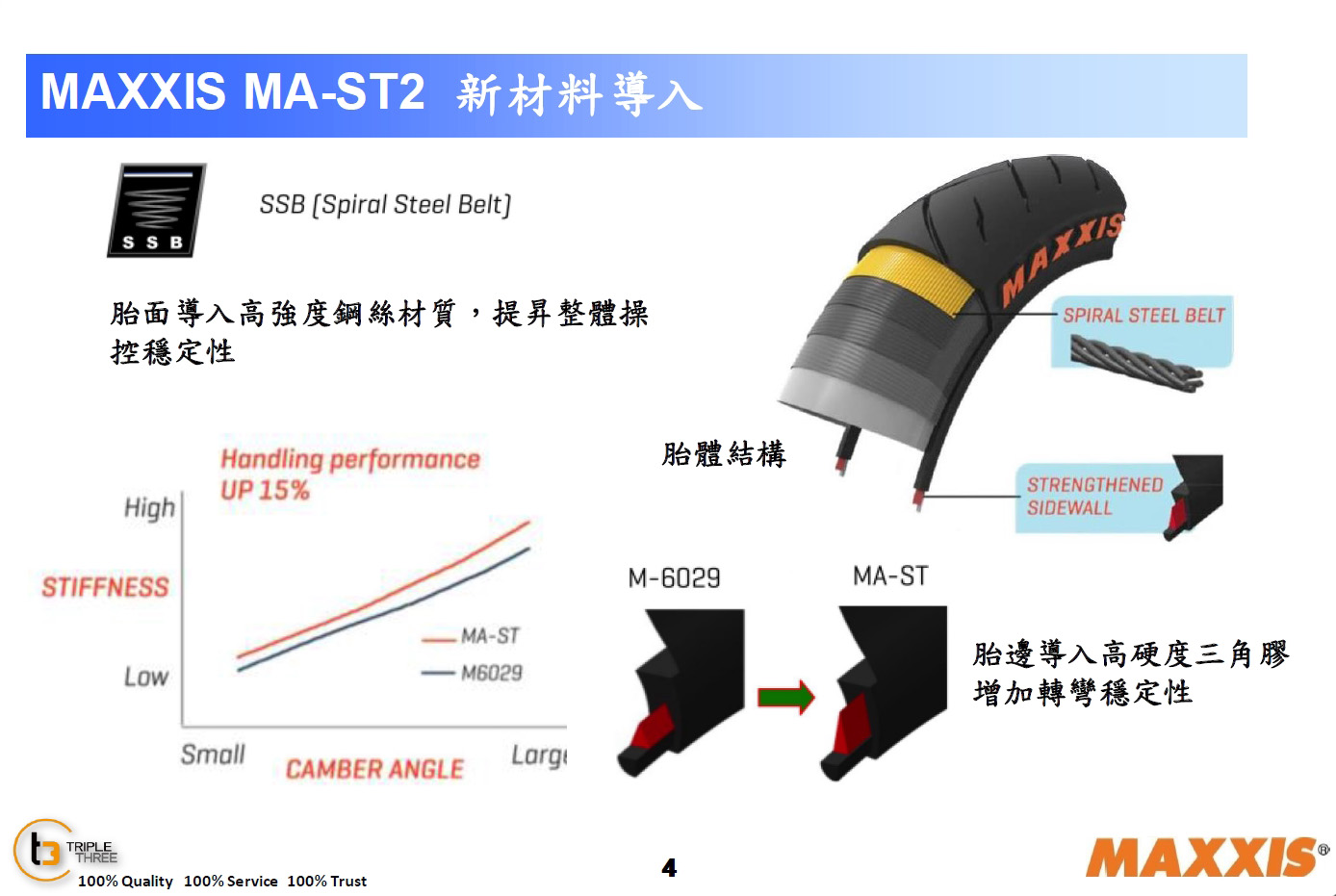 胎體打掉重來,MA-ST2使用輻射層鋼絲纏繞技術,胎面更使用高強度鋼絲強化,提升行駛與操控穩定性,胎唇邊加上度三角膠層補強,使胎壁更為堅固,過彎平穩,而胎體強度大幅提升,同時也造就MA-ST2絕佳的載重能力,就算是重達300kg的旅行車款也能穩穩撐起,對於一款輪胎而言如此大的車種包容性並不容易。