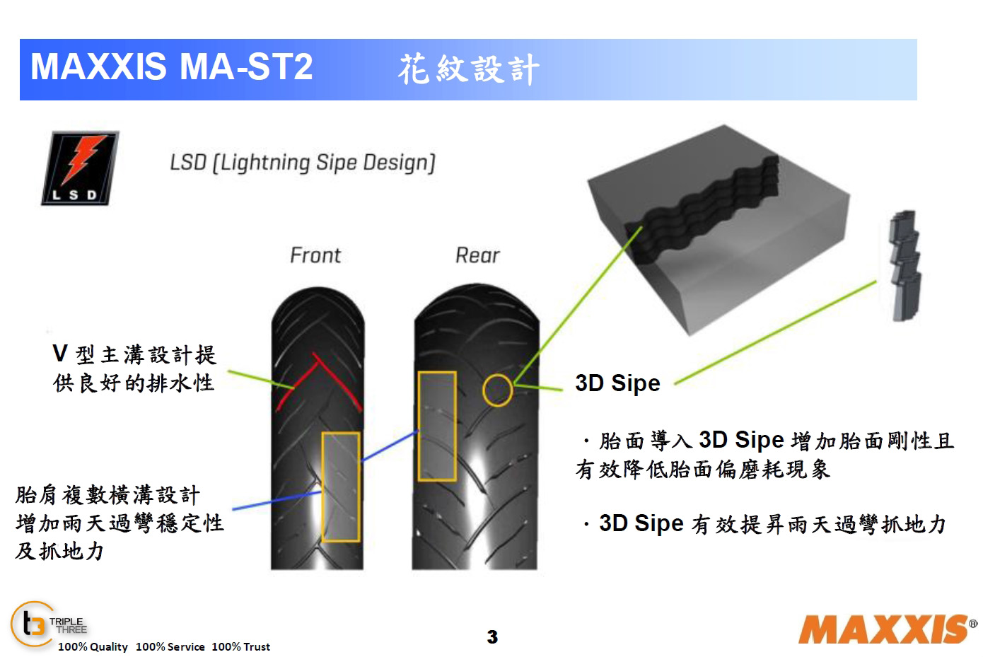 而藉由胎體結構、胎紋設計、胎膠配方多管齊下,全方面大幅提升,經儀器分析MA-ST2接地壓力平均,受壓時變形量更小,這代表的是騎士將擁有更好的車輛穩定性與抓地力,而這些正是安全行駛的必要因素。