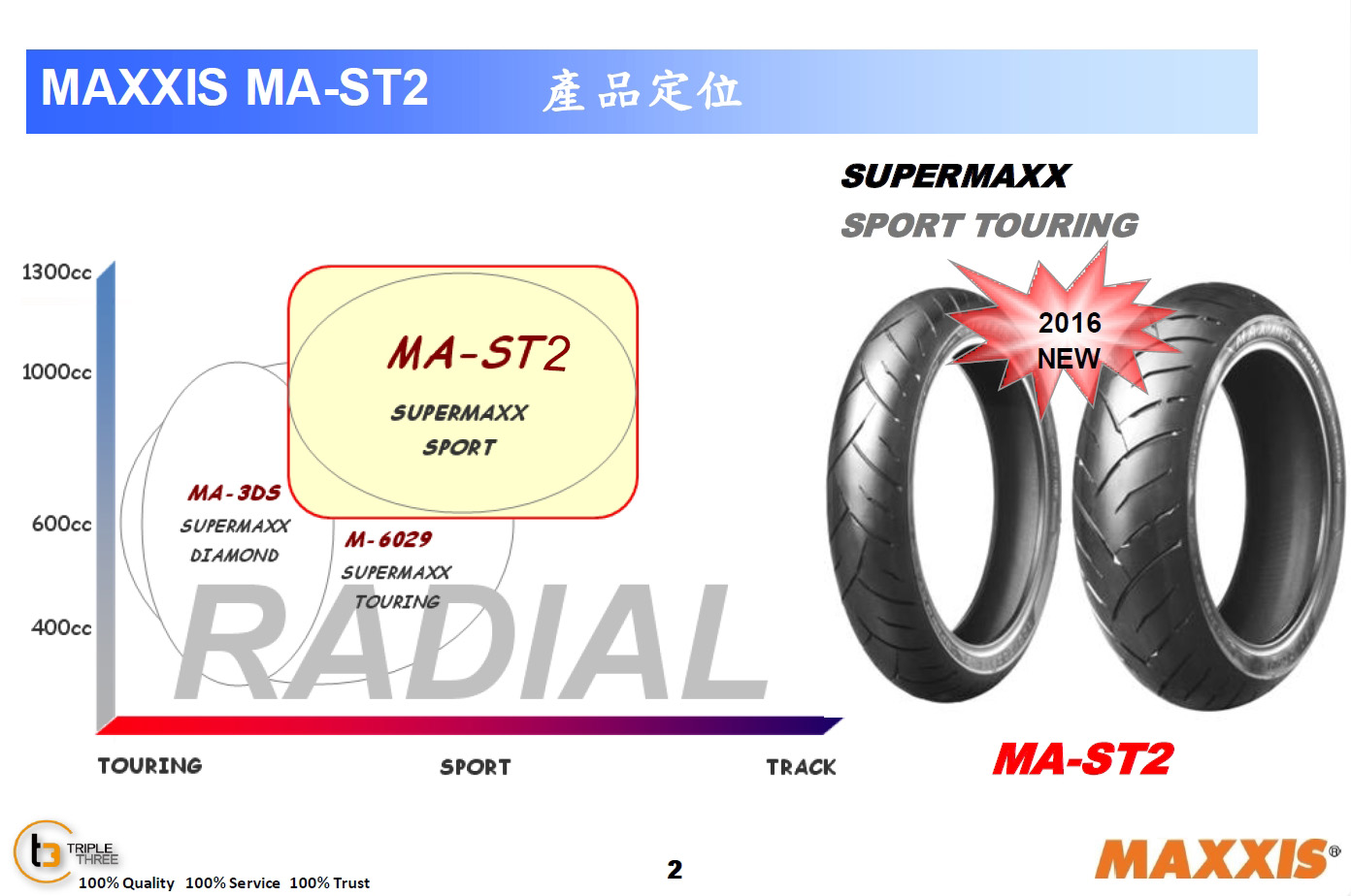 MA-ST2定位於排氣量600c.c.~1,300c.c.或以上之車款,涵蓋範圍廣泛不論是街車、街跑車、旅行車皆可使用,屬於全方位的胎款。MA-ST2導入最新胎紋設計,使用3D Sipe技術,排水性良好,且能有效增加胎面剛性,使輪胎隨時都能擁有最佳的接地面積,同時能有效減少胎面磨耗不均的問題。