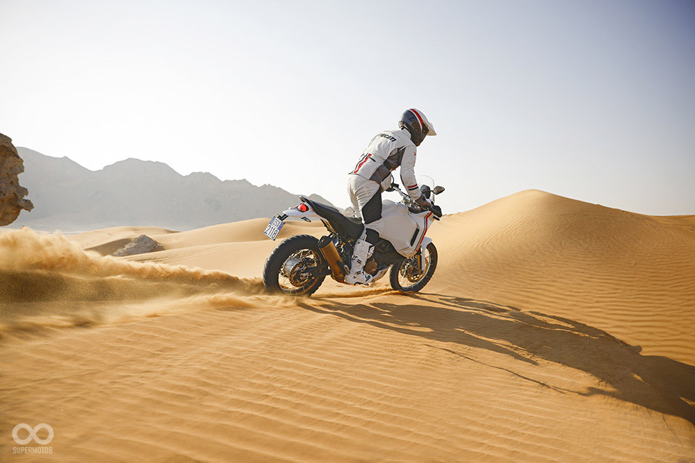 為了確保DUCATI DesertX是一輛真正可以玩土的雙缸冒險王,義大利人也給你滿滿的越野裝備,超大的21L油箱絕對可以讓你騎個三天三夜,若你還不滿足可額外選購位於“車尾”的8L油箱套件,讓你浪跡天涯都不用加油;引擎下護板也是包好包滿,加上前21後18的鋼絲框、Pirelli的Scorpion Rally STR輪胎。
