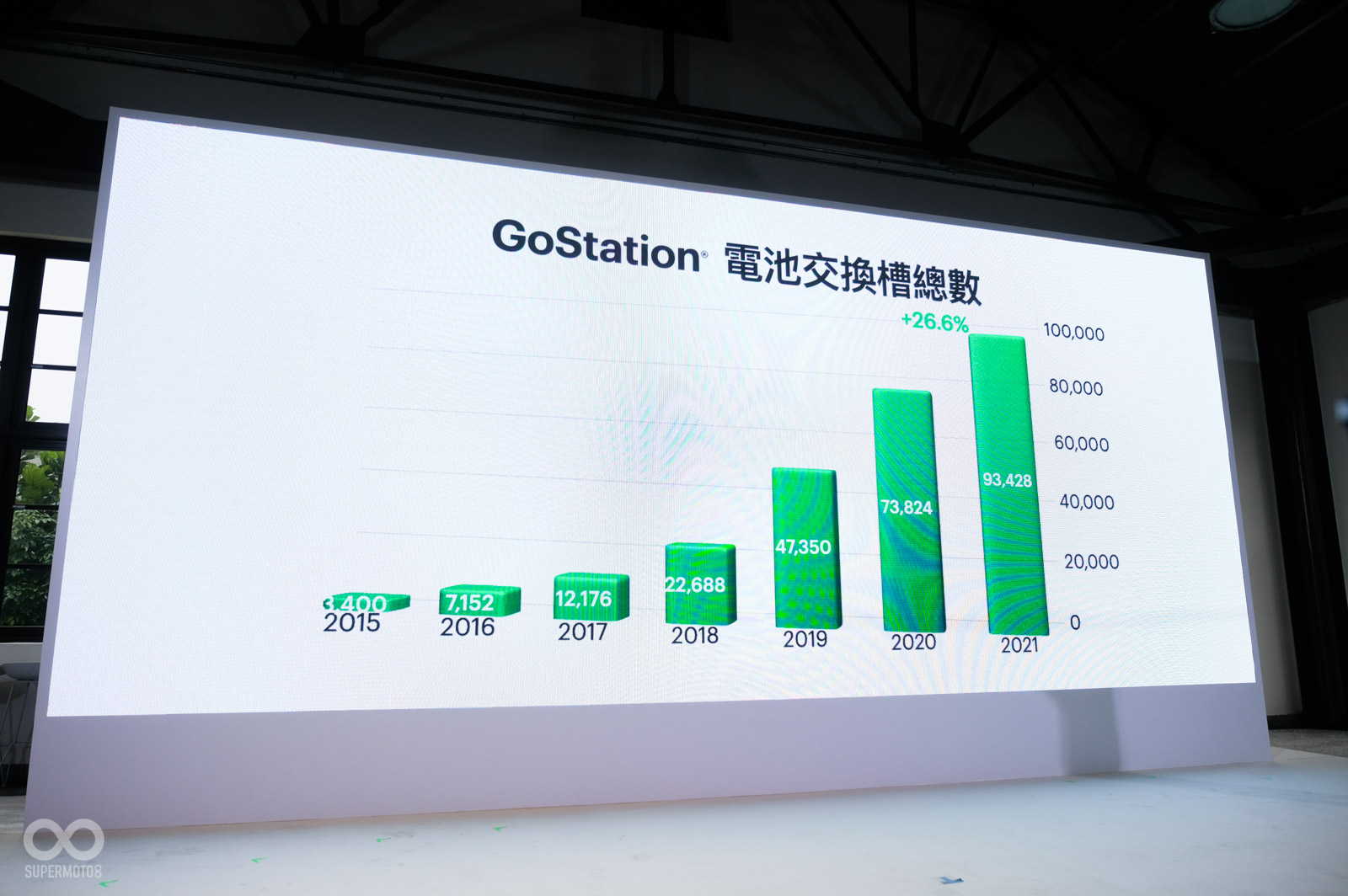 直到2021年底目前有2215站,但總電池槽數來到驚人的93,428槽,超多的電池數希望所有騎士都可以換到滿電電池,甚至2019年以來Gogoro也全數供應新版電池;如果跟加油站對比台北市換電站是加油站的2.32倍、新北市1.53倍、高雄市1.11倍。電池交換站目前也以加油站、便利商店、超市為大宗,2022年會持續加強與政府場域合作。