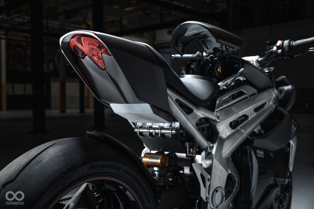 不同於部分品牌電動車,主打科幻未來潮流的外觀風格,TRIUMPH TE-1相當直接直接沿用SPEED TRIPLE外觀設計,甚至車架造型在電動版本上看起來更為狂野,肌肉感十足的簍空設計殺氣騰騰;頭尾燈樣式看起來都直接沿用三缸版本上的零件,充電需透過掀起油箱位置飾蓋插電充電,也因為取消油箱設計,整車的線條變得更為低扁。