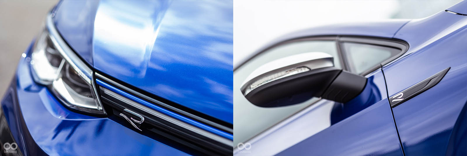 除了以上比較大的改變外,Volkswagen Golf Variant R也在外觀細節展現出不同於Golf Variant,例如車頭除了貫穿的LED日行燈外,額外拉出一條水平藍線與水箱護罩點綴R Logo,前葉子板上也有R字樣點綴其上,一旁搭配銀色後照鏡,最後你絕對不能忽略Golf Variant R專屬的亮銀車頂架。