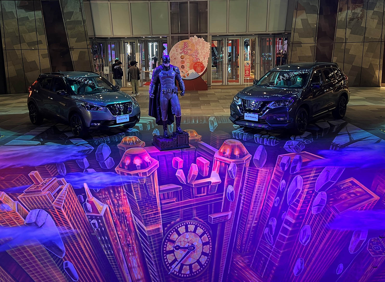 NISSAN在2月26日至2月28日期間,於新北市板橋大遠百舉辦KICKS「夜行版」及X-TRAIL「夜行版」3D地景藝術外展上市活動,與台灣知名3D藝術家蘇家賢老師合作,運用創新多元的藝術方式打造電影場景,透過汽車、電影與3D地景藝術的結合,讓民眾可以進一步的感受NISSAN KICKS「夜行版」與X-TRAIL「夜行版」的車型魅力。