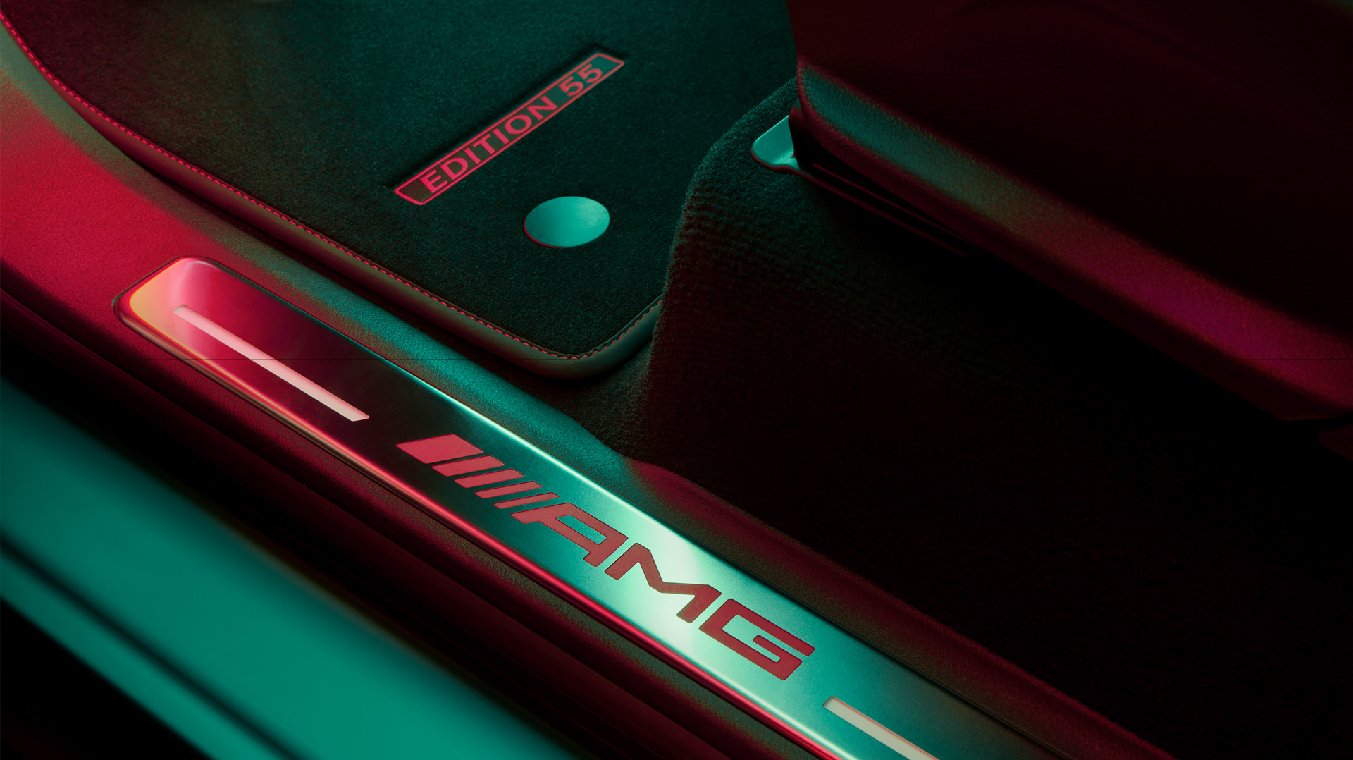 打開車門,首先會看到門檻上的AMG金屬飾板,字體散發著紅色光源。進到車內,腳踩著AMG黑色地板,邊緣以紅色車縫線處理,且繡有Edition 55字樣。駕駛者前方向盤以麂皮包覆,在六點鐘位置可看到AMG和55標誌。其餘還有碳纖維飾板包覆的中控台、門板,座椅採用黑色和紅色真皮做搭配,強烈的運動感席捲經典G-Class。