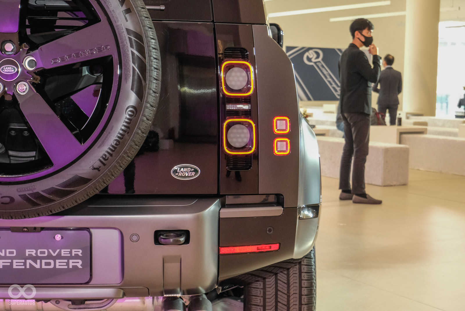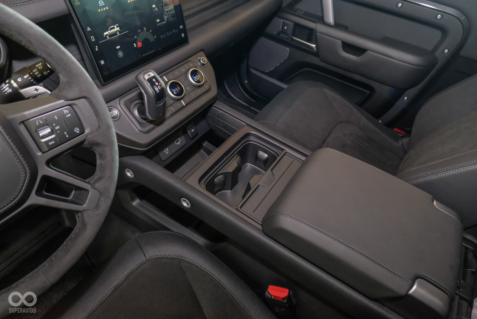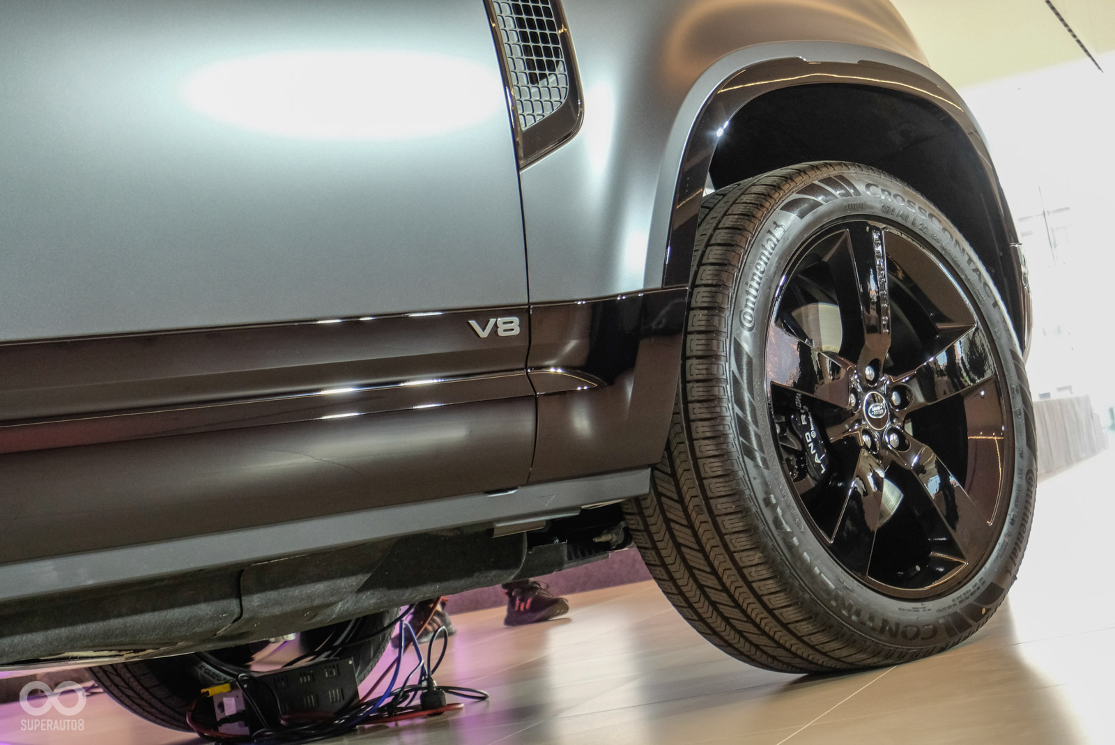 外觀上最大的亮點莫過於頂級喀爾巴阡灰金屬漆搭配緞光防護膜包覆,引擎蓋、尾門與車頂則保留亮光烤漆點綴彰顯V8車型的不凡氣勢,輪框更直上視覺張力極大化的22吋亮黑色鋁合金輪圈,搭配車門上的V8銘牌,證明這台Land Rover Defender不只可以越野,公路呸車也是不輸人的!