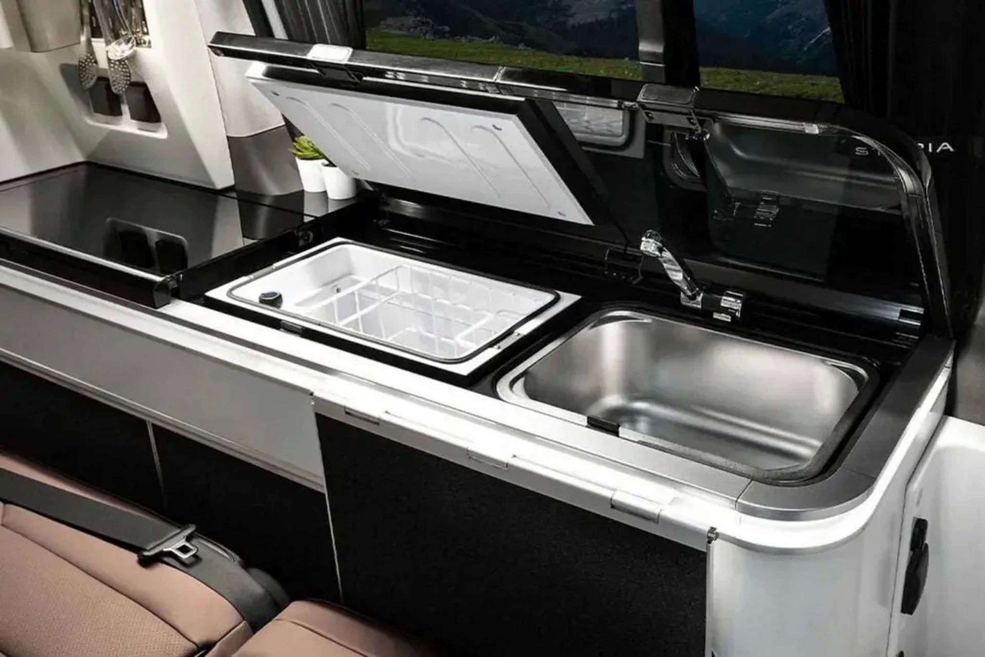 車內配備,11人座的版本只有座椅以及展開後的床,4人座版本部分就相當豐富。首先在座艙的一側可看到系統廚具,包含洗手台、冰箱以及料理桌,冰箱的尺寸為36公升,水箱部分則為70公升,廢水箱則有40公升。其餘還有可折疊的桌椅、後方可拆卸淋浴設備等。而車內的電子設備則是由12.1吋觸控螢幕統一控制及監控,就如同外觀造型相當有科技感。