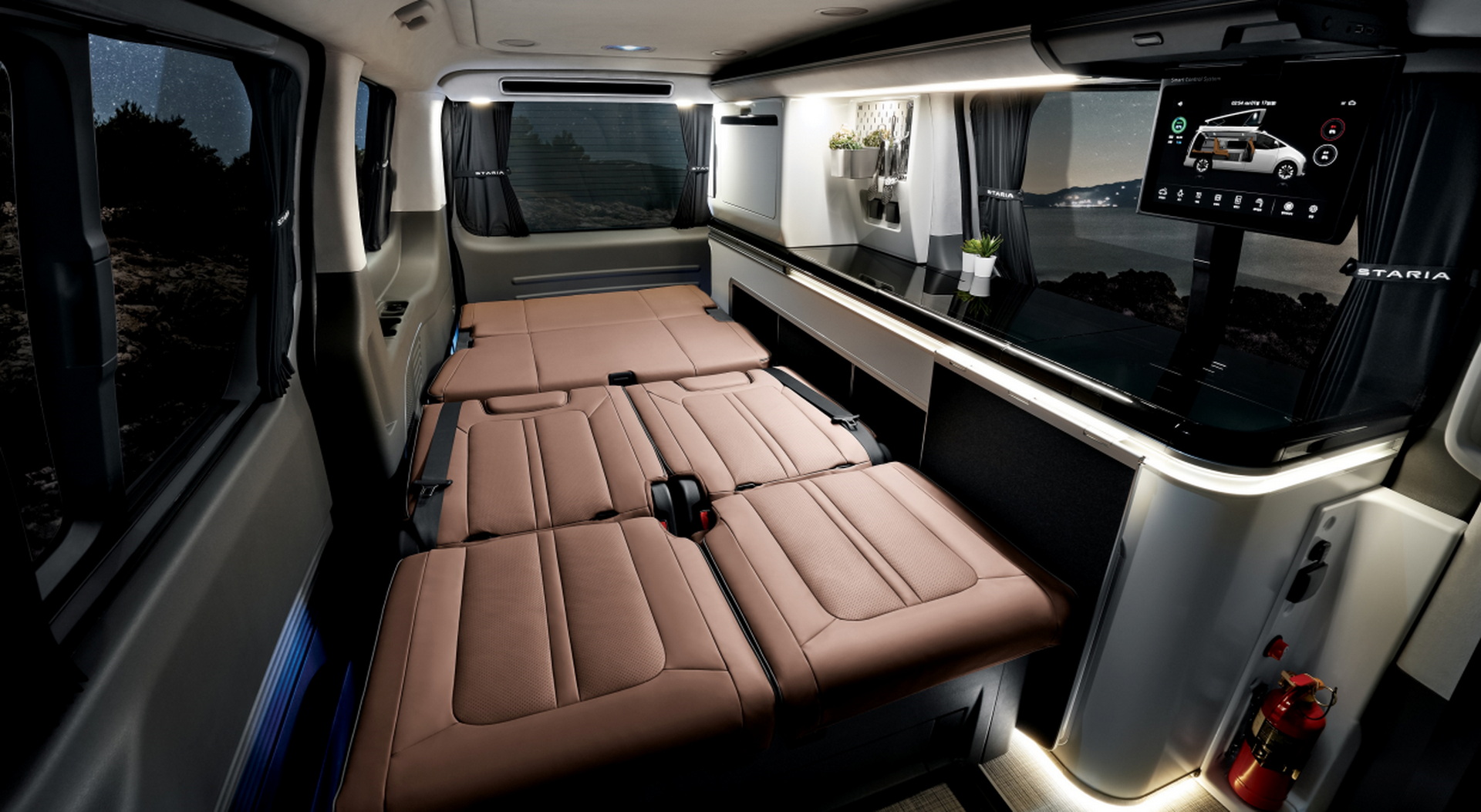 Staria Lounge Camper在車內布局有分兩種,一種是可容納11人座位的設定,另外一種則是指可乘坐4人。在這兩種情況下,都可以座椅完全倒平形成一張舒適能睡兩位成人的大床,而展開的車頂帳,則有一張額外的雙人床墊,可容納另外兩位成人。