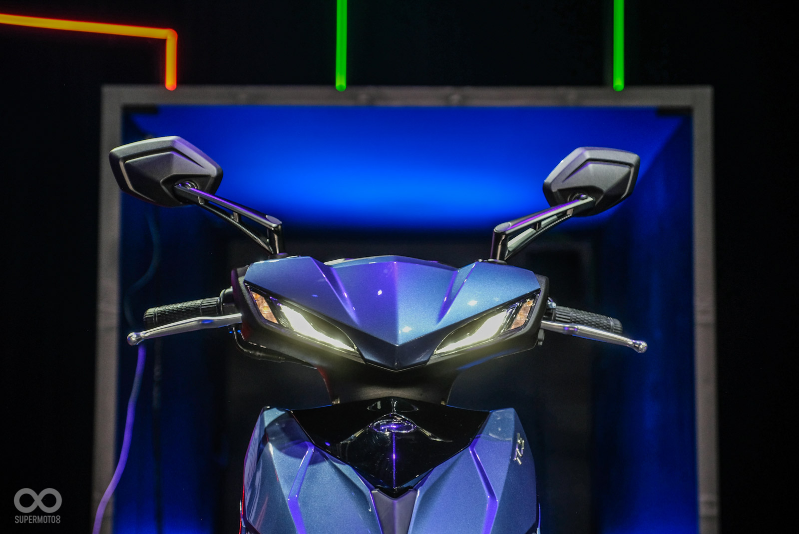 首先在車頭部分,2022 KYMCO VJR 125維持和前一代類似的尖銳車頭造型,招牌的V型線條刻畫讓VJR 125從正面看上去充滿競技感,大燈採用LED投射式大燈,造型和前一代略微不同,前面板中央的鼻梁部分也稍微縮短,讓整台車看起來更有跑格。