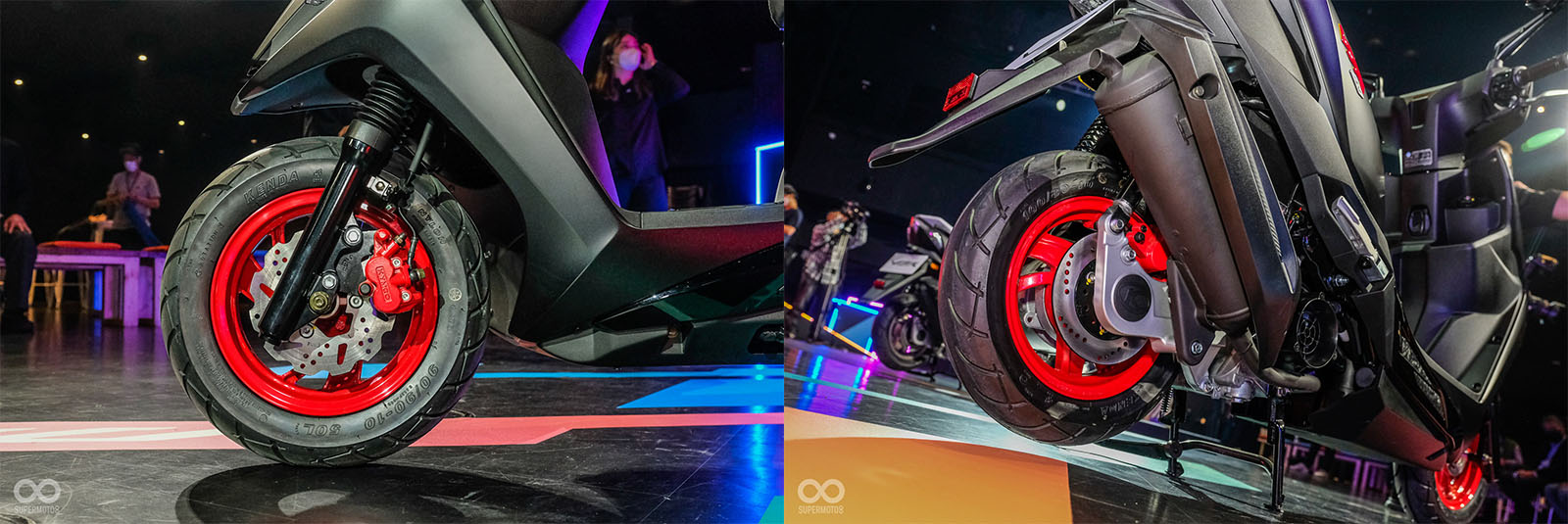 煞車搭載前浪花碟配雙缸卡鉗,前後碟盤皆為180mm,前後也具備ABS系統;此外在TCS版本上還專屬升級金屬煞車油管;輪圈部分採用六爪鋁合金輪圈,輪胎尺寸為前90/90-10和後100/80-10。