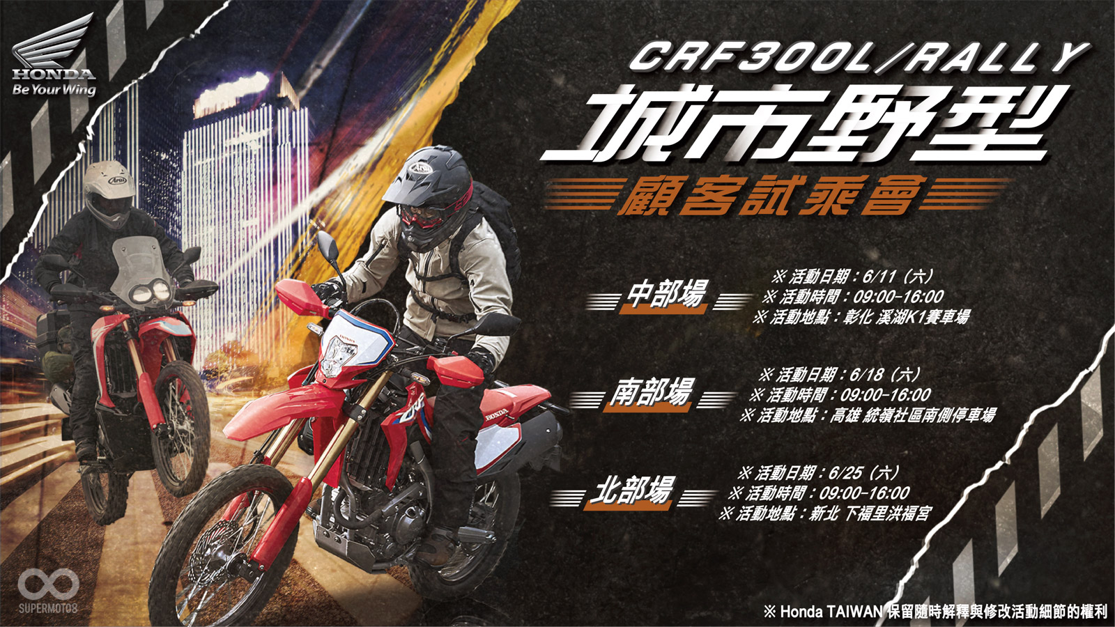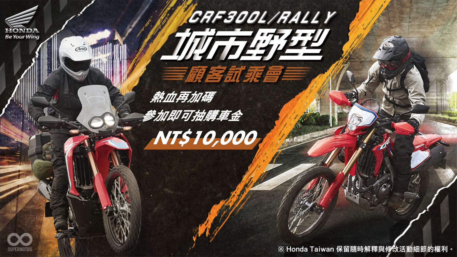 CRF300L/RALLY其越野、日常通勤的兩用性能,無論是城市中靈活輕巧的日常通勤需求,或是征服惡地的冒險探索,多面向的任務CRF300L/RALLY都能勝任。粗獷冒險的車體設計外觀,讓CRF300L/RALLY騎乘時更能展現其與眾不同的帥勁。在「城市野型」試乘會中,特別針對其特色,設計有別於以往試乘活動的關卡;突破越野車只能在土路玩的刻板限制,在封閉安全的柏油路面體會其同級車最輕的車體靈活,以及對應各種路況的長行程懸吊設計。讓CRF300L/RALLY的帥不只在山林野地,更能在城市街道展現個性騎士的強烈風格。另外,參加活動的車友也可獲得萬元購車金的抽獎資格,敬請把握有限的名額前往報名。