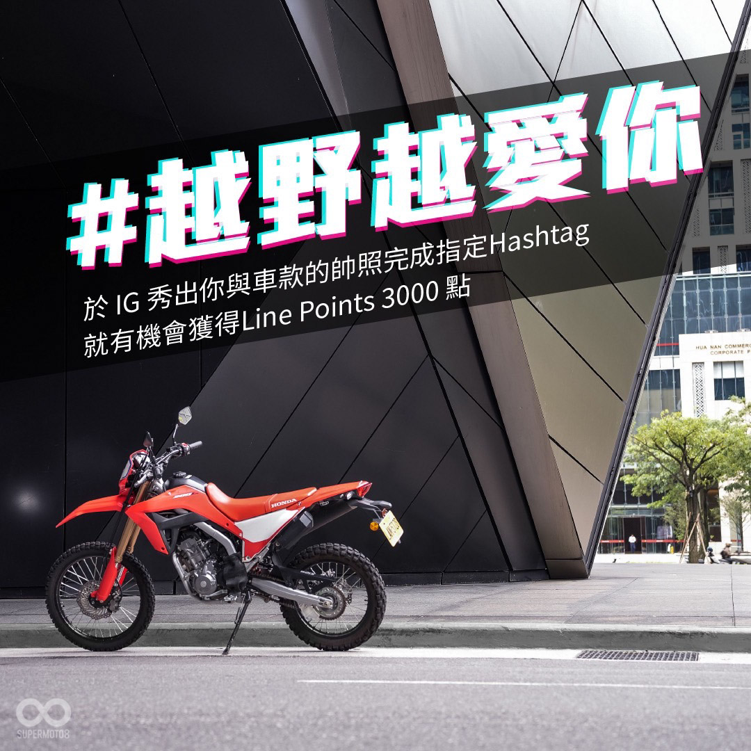 Honda ADVENTURE車系的CRF300L/RALLY系列,具備ON/OFF功能的多用途使用機能,在全台已累計超過千位車主。為了壯大「野」人聲勢,Honda Taiwan號召CRF300車系車主,秀出與愛車的帥照。活動期間內於個人Instagram頁面中公開分享自己和 CRF300L或CRF300RALLY的帥氣合照,貼文標註 @hondamotorcycletw 官方IG,並加入指定Hashtag#越野越愛你,獲得最高按讚數的貼文,就能獲得LINE POINTS 3000點。而尚未購入CRF300L/RALLY的朋友,也能到門市賞車合照參加活動,體驗CRF越野車系的帥氣魅力。