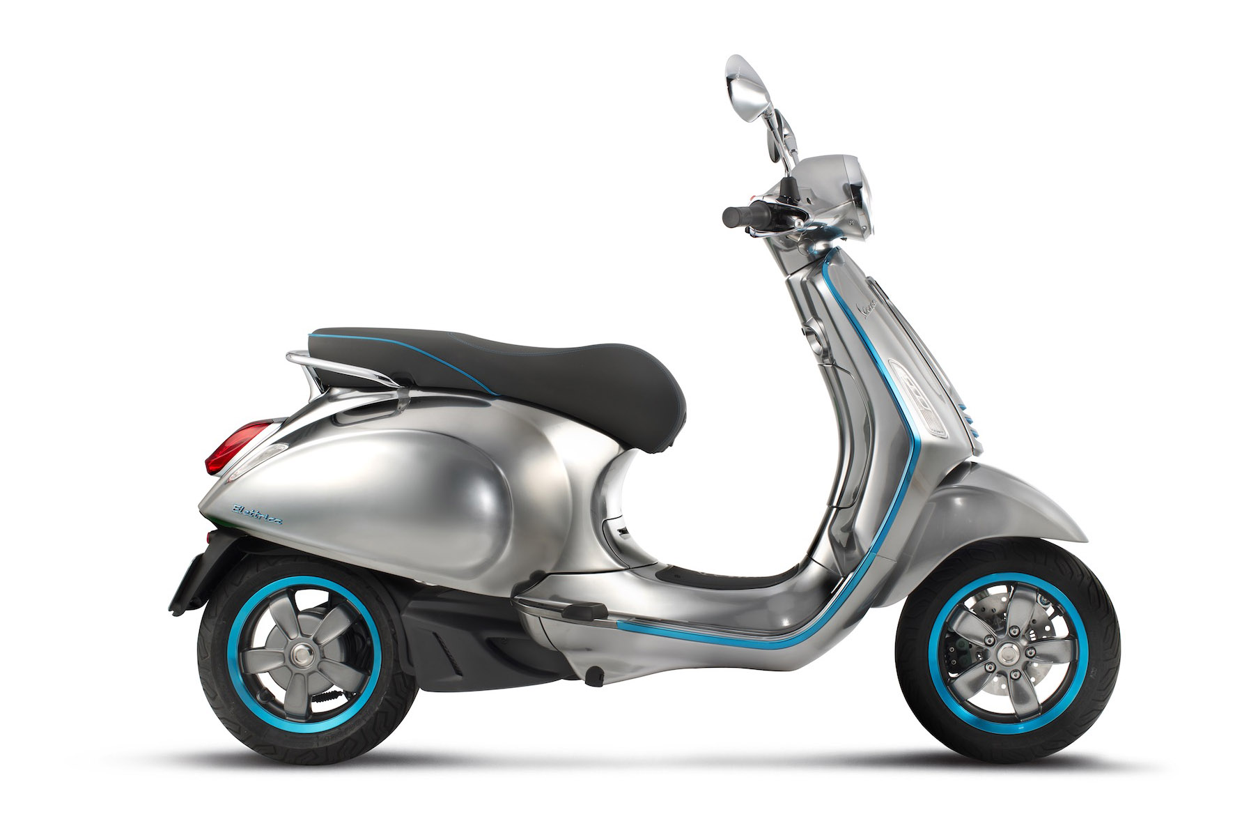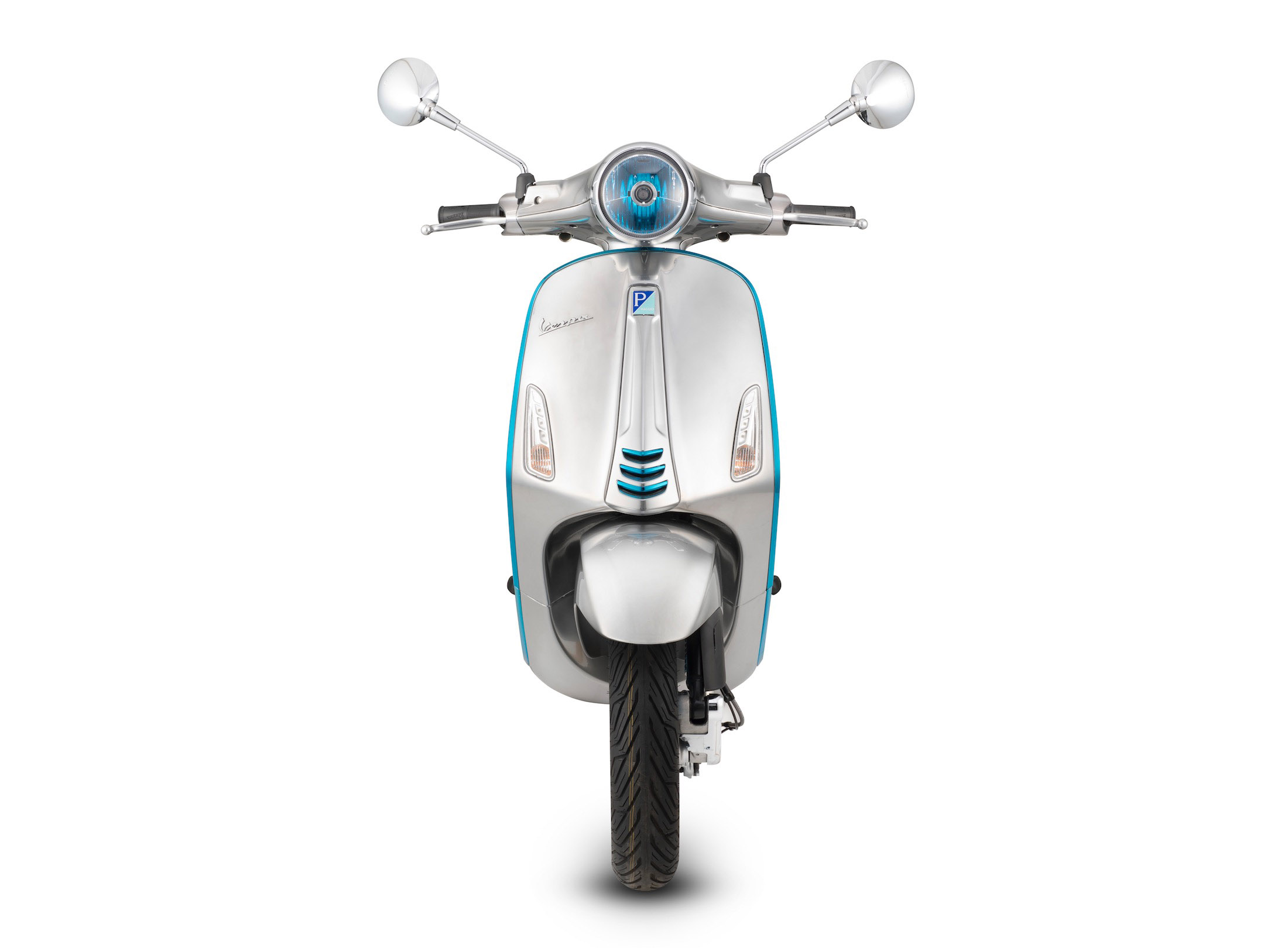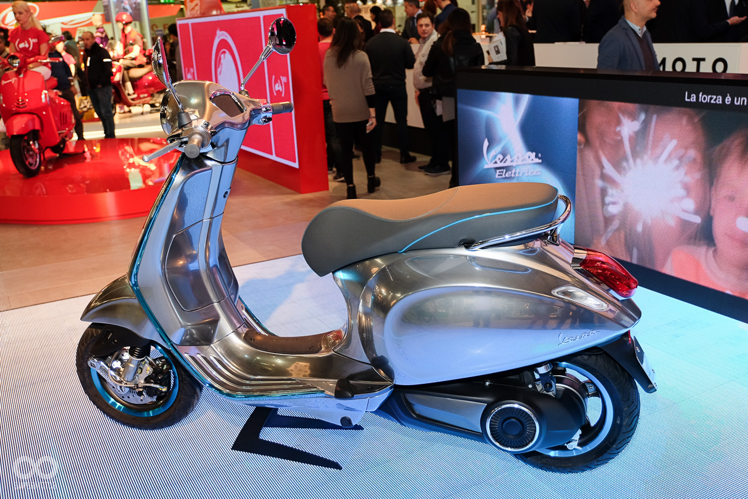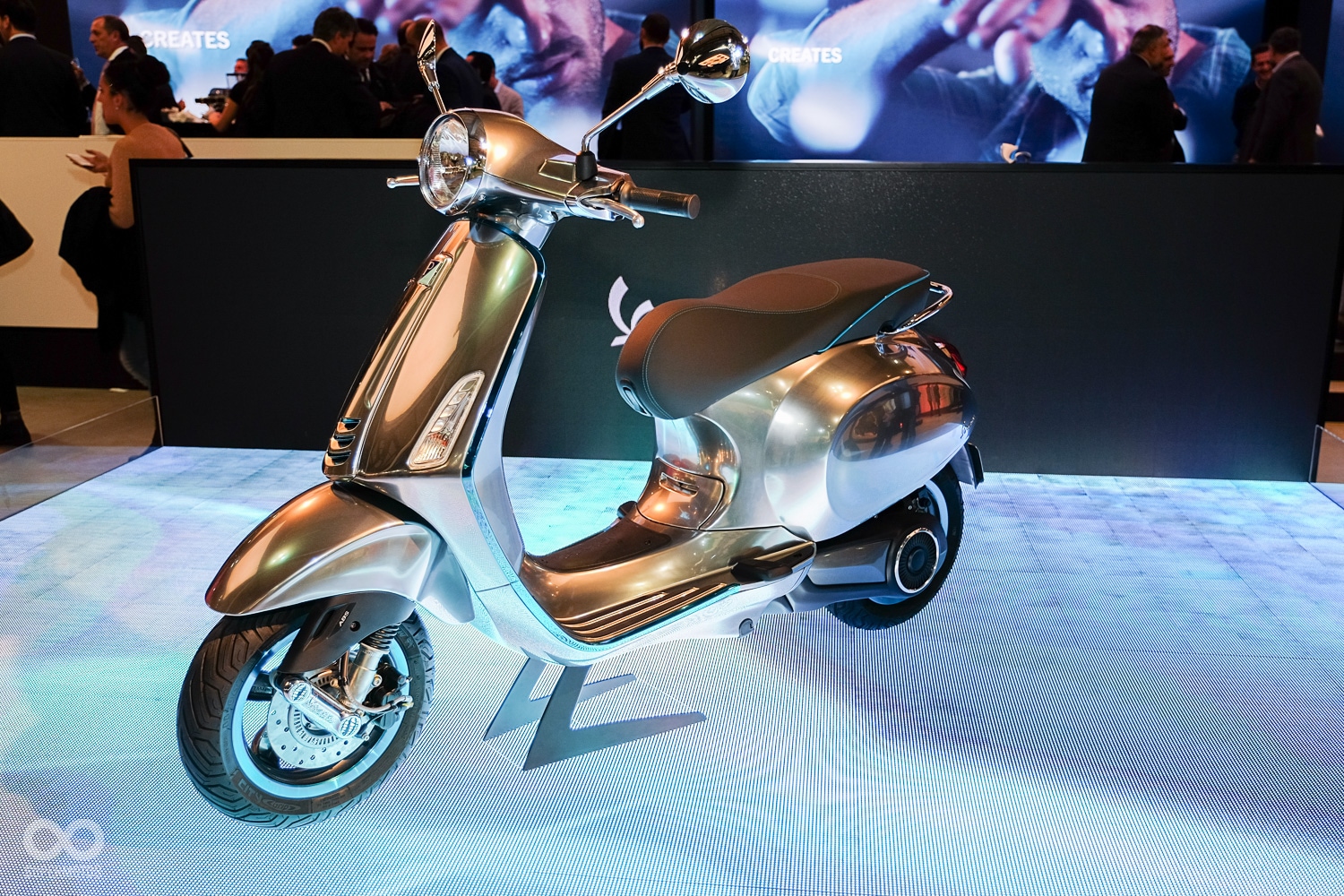 而在一年一度的米蘭車展中Vespa更是展出了一台新奇的概念車款,造型酷似Primavera車系,全車金屬原色搭配上金屬藍鈎邊,科技感十足,從車側看去,前後皆使用單槍避震的獨特設計,加上沒有排氣管的阻擋,使得輪框造型完全顯露,造型優美又俐落。