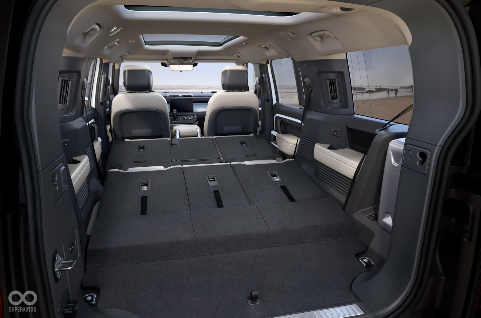受益於劇院式座椅設計,第二排和第三排的乘客也得以獲得優異的視野。透過第二排座椅前、後滑動並向前折疊以提供寬敞的開口,進入第三排也毫不費力。在車尾,車主可以通過後廂空間內的調整按鈕輕鬆降低 Defender 的電子式氣壓懸吊,使裝載物品到後廂時更為便利。