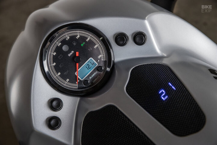 所有的線組都被隱藏在車把裡面,Acewell Speedo的儀表板附加幾組按鈕來當擔綱基本功能,順帶一提,這台R Nine是Keyless系統,只需要一個遙控器就可以啟動。