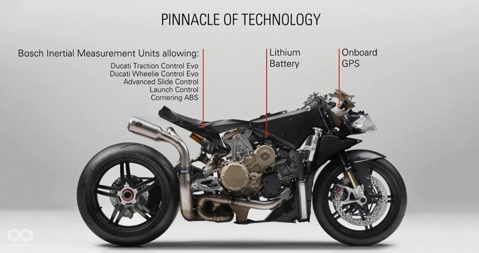 而一台馬力重量比如此誇張的車,電控系統自然不能少,除了基本的騎乘模式、動力調整之外,Superleggera還導入了先進的6D IMU六軸向慣性量測,在此系統的幫助下DTC(Ducati Traction Control)循跡控制、DWC(Ducati Wheelie Control)前輪浮舉控制、DSC(Ducati Slide Contro)側滑控制與BOSCH的ABS cornering都能取得更精準的反饋訊號,使作動更為精確,騎士也獲得更完的保護。