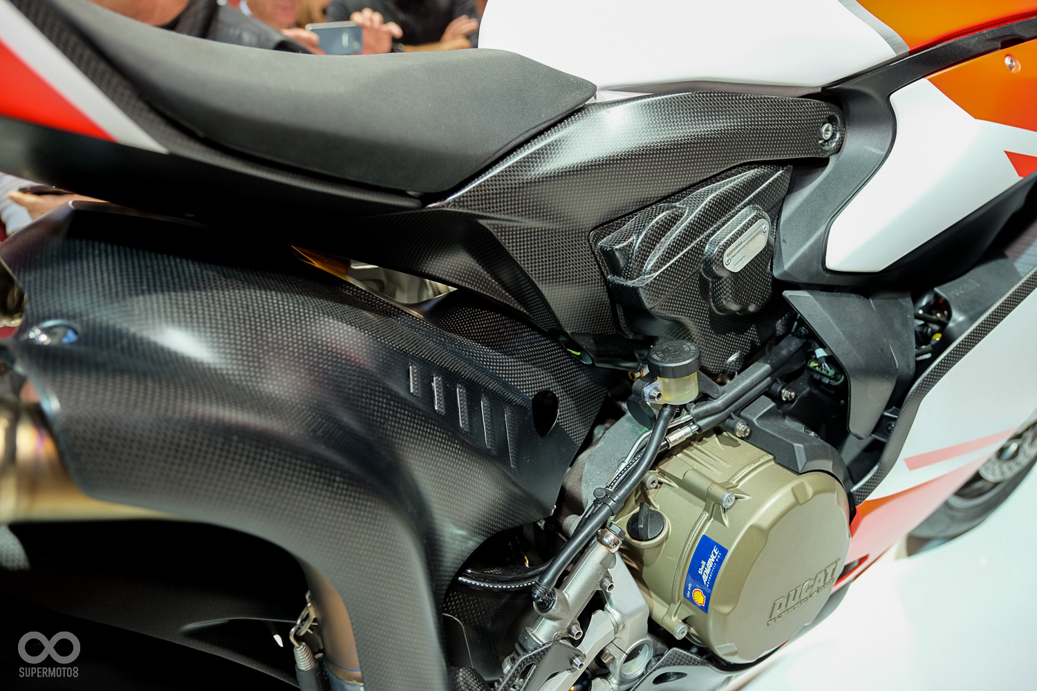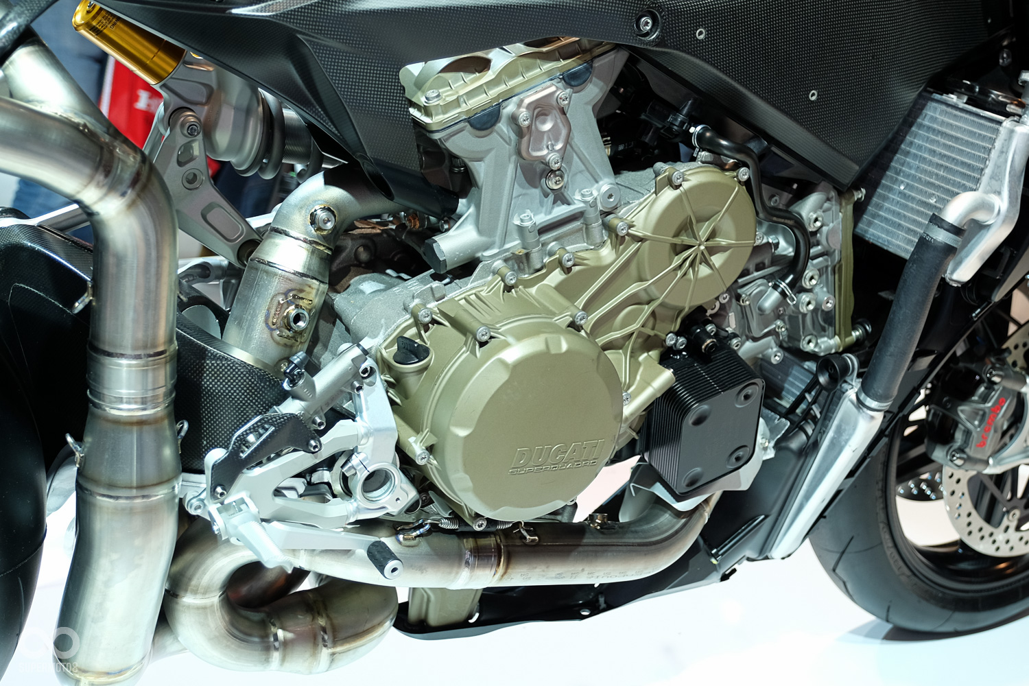 引擎排規格維持不變,同樣使用排氣量1,285c.c.的Superquadro L型雙缸水冷引擎,但內部設定完全不同,Superleggera封值轉速更高,與標準版相比動力曲線陡峭許多,著重於高轉速域表現動力也更為猛爆,引擎內部做了相當多的調整,活塞、曲軸、汽門皆經過大幅度偷輕,並於表面施以DLC類鑽石鍍層,以降低表面摩擦力減少運轉阻力,使轉速拉升更為輕快順暢。