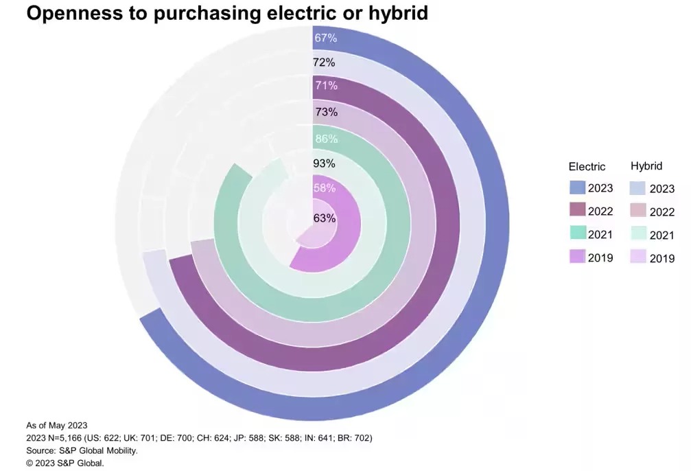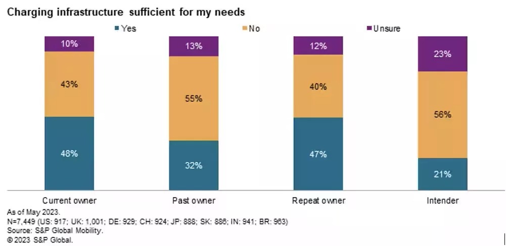 根據S&P的調查顯示,全球有將近一半的消費者表示電動車的價格過高,但是大部分的人也都可以理解電動車技術的確是昂貴的,因為這項科技的成本本來就高,而除了價格是電動車的最大障礙之外,依舊有46%的人擔心充電時間,而有44%的人擔心充電站是否可以使用,不過好消息是絕大多數的受訪者願意花費30~60分鐘進行充電,但有趣的是只有51%的電動車車主擁有家用充電器,而且大部分的人都不願意支付額外費用安裝充電樁,反而大家都想在工作地點或是公共充電站進行充電,但這可能會增加擁有成本。