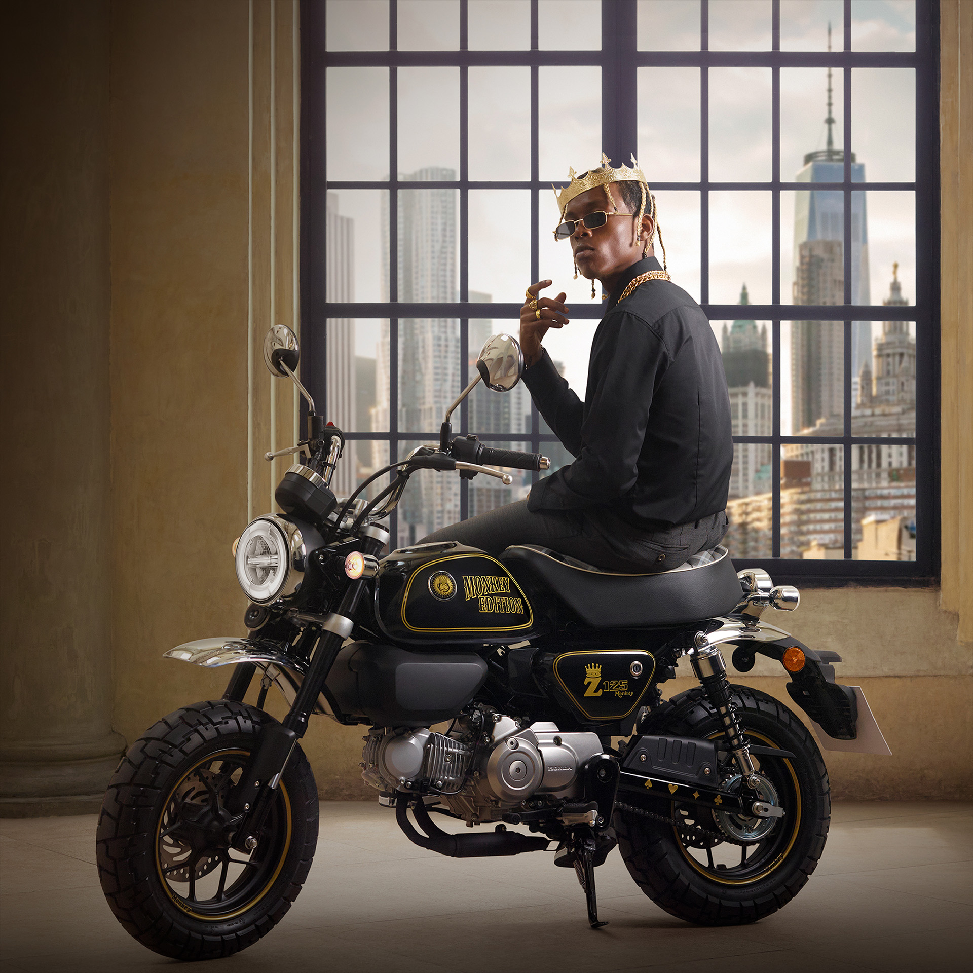 這台Honda Monkey 125「King Special Custom Edition」以黑色打底,在油箱、側蓋和輪框上都以金色拉線作點綴,油箱上印有酷炫MONKEY EDITION字樣和戴著皇冠的猴子裝飾圓標,側蓋上也同樣以金色字體呈現帶著皇冠的Z125 MONKEY字樣。