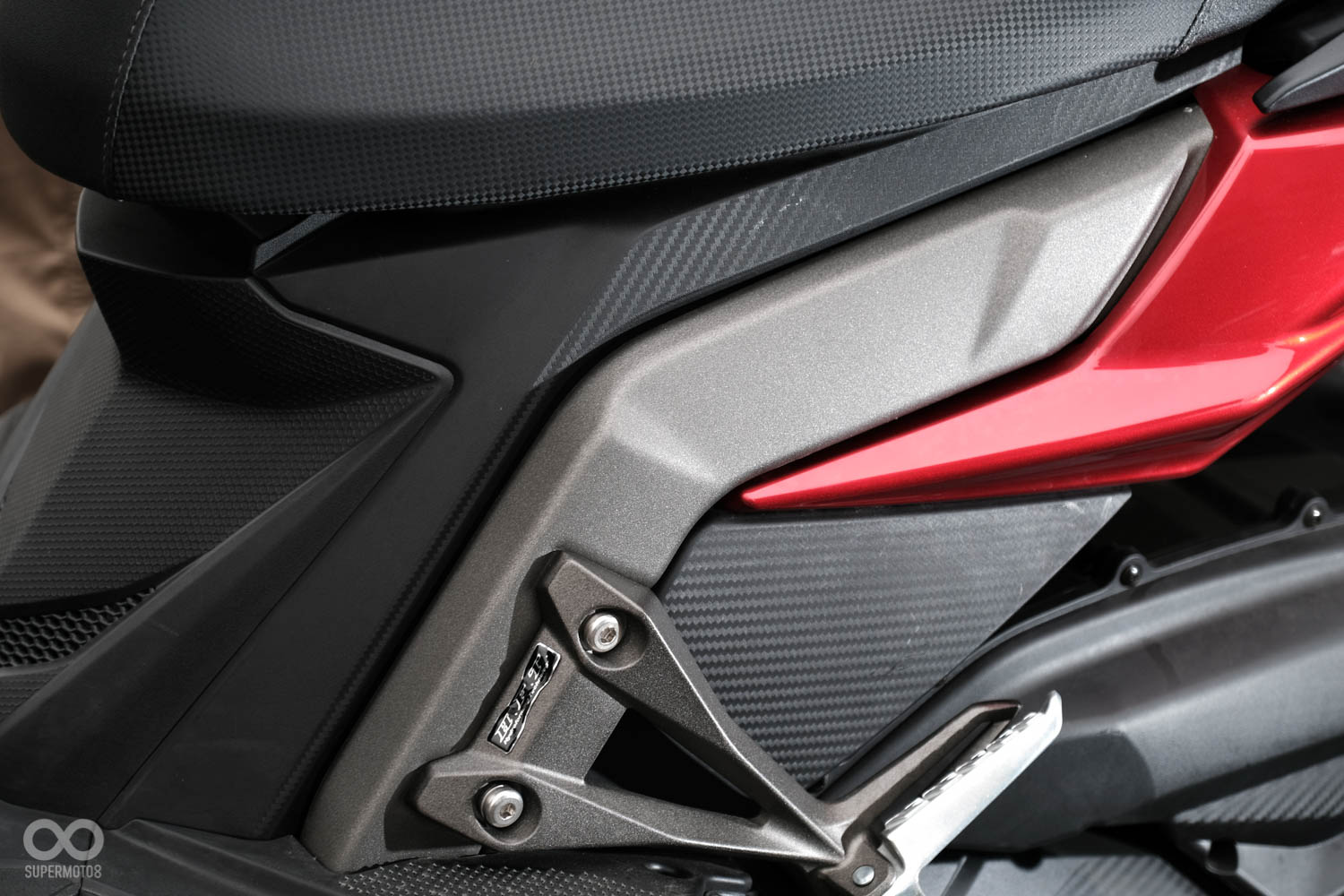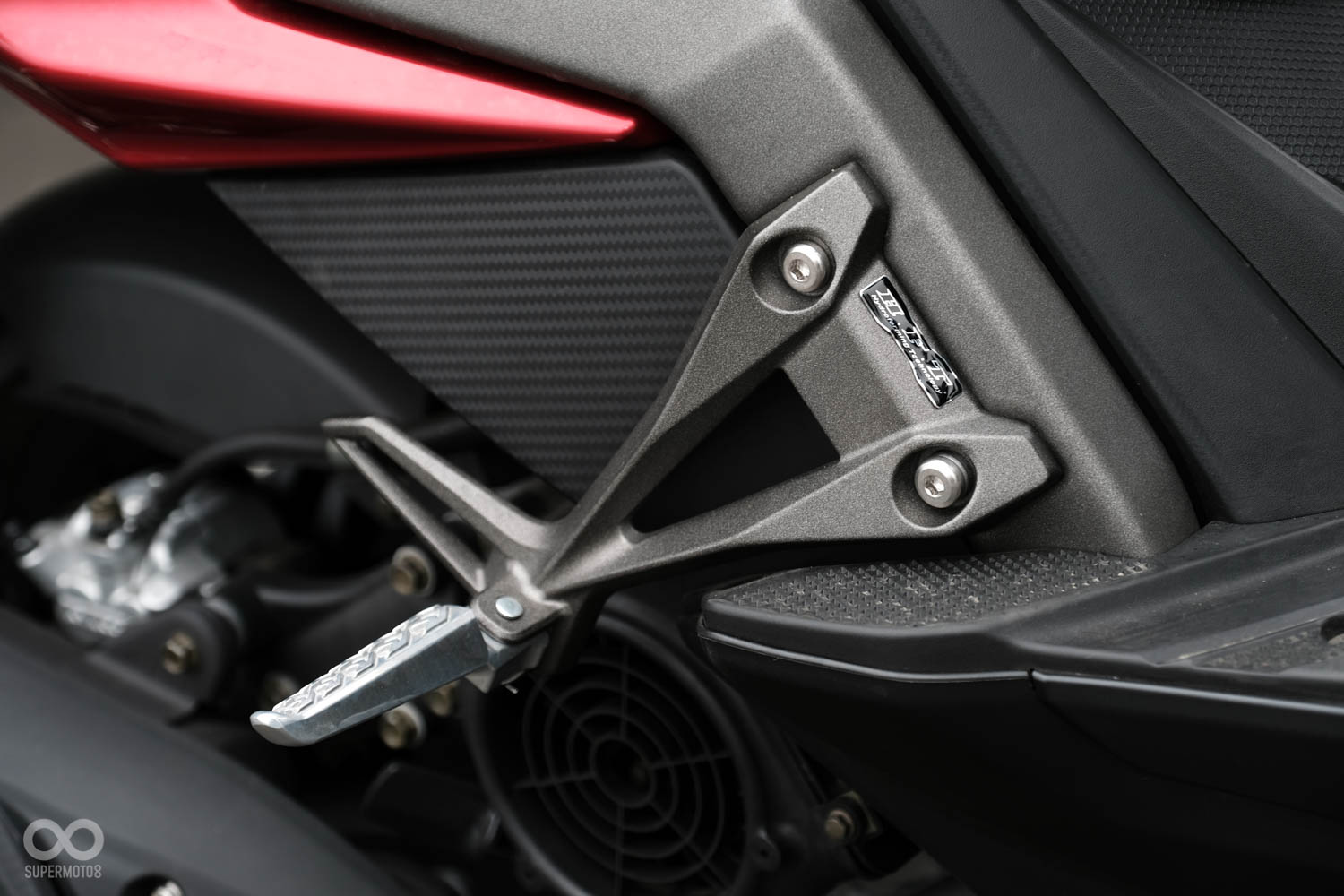 除了車體造型,部分的配件、細節Racing S 150也有著不同的詮釋,在握把的兩端加上了平衡端子,除了對於操控有所幫助,鍍鉻的材質更是亮眼,兩側的後座踏桿也是全新的設計,一體成形的支架切削精美,搭配上外露的液壓成形車架,輕輕的勾勒出大型重機的機械張力,土除的部份也改成了內外分離式設計,內土除將泥水完全隔絕避免噴濺,而短小的大牌架更是讓車尾輕盈俐落許多,動感明快貫串全車,營造出與Racing S 125截然不同的戰鬥氣息。