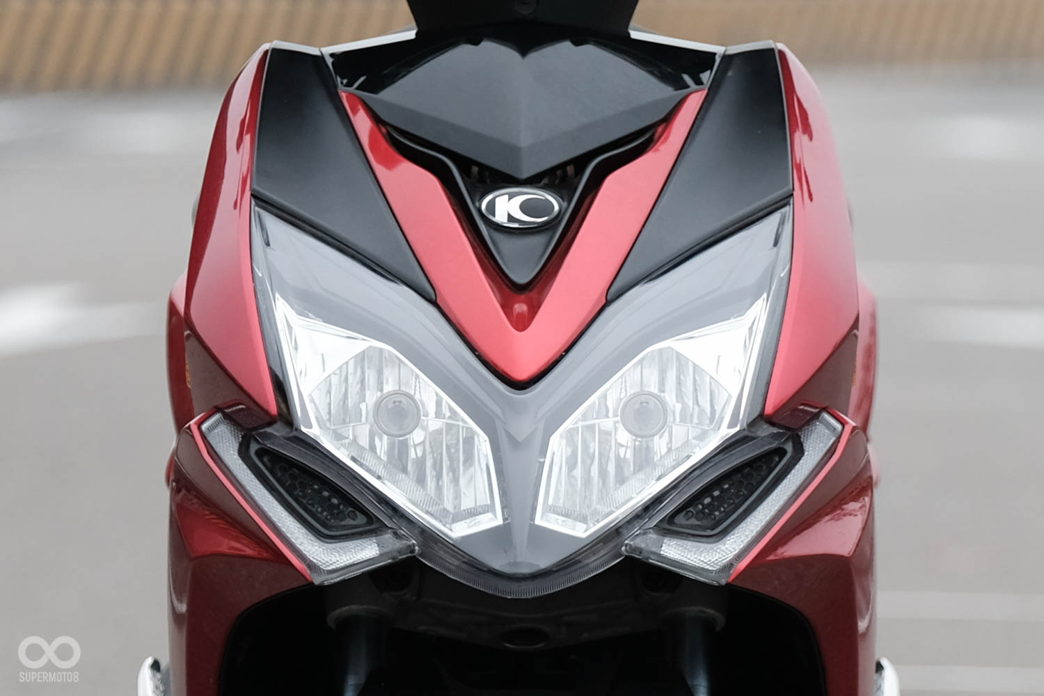 造型方面KYMCO為Racing S 150加入了更多的動感元素,前斜板的線條誇張化,使用雙材質雙色的漆面處理,讓車頭的輪廓更加深邃、霸氣,甚至顯得有些凶惡,而車身兩側切線也從原本圓潤優雅的風格變得更為積極,折線切削的更為銳利,寬度也略做縮減,讓整體的運動感更為強烈。