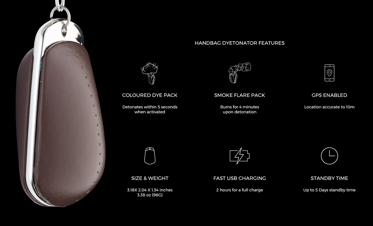 飛車搶劫通常以身形瘦弱的女性作為目標,受害者往往無力反抗,甚至遭到歹徒拖行,進而產生更嚴重的傷害,而搜索加害人更是困難,多半只能依靠路口監視器拼湊線索;Handbag Dyetonator的概念以保護受害者為出發,掛飾內藏GPS發信器,以及可遠端引爆的防盜粉包,只要透過手機發出訊號便能遙控引爆噴出粉末,防盜粉本身難以清洗,能清楚的標示出歹徒的身份,而GPS定位更是讓嫌犯無所遁形。