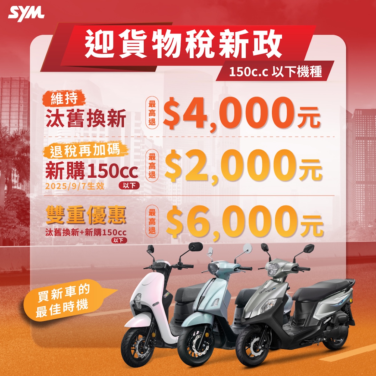 原購買150cc以下燃油機車汰舊換新減徵貨物稅4,000元,加上新購機車減徵2,000元,共計6,000元的貨物稅減徵補助。SYM為慶祝賽事衛冕年度總冠軍,再加碼2,000元購車金回饋消費者。針對未納入政府新購補助的JET SL+ SuperC,SYM額外補貼2,000元,確保所有JET車系車主都能享有同等優惠。