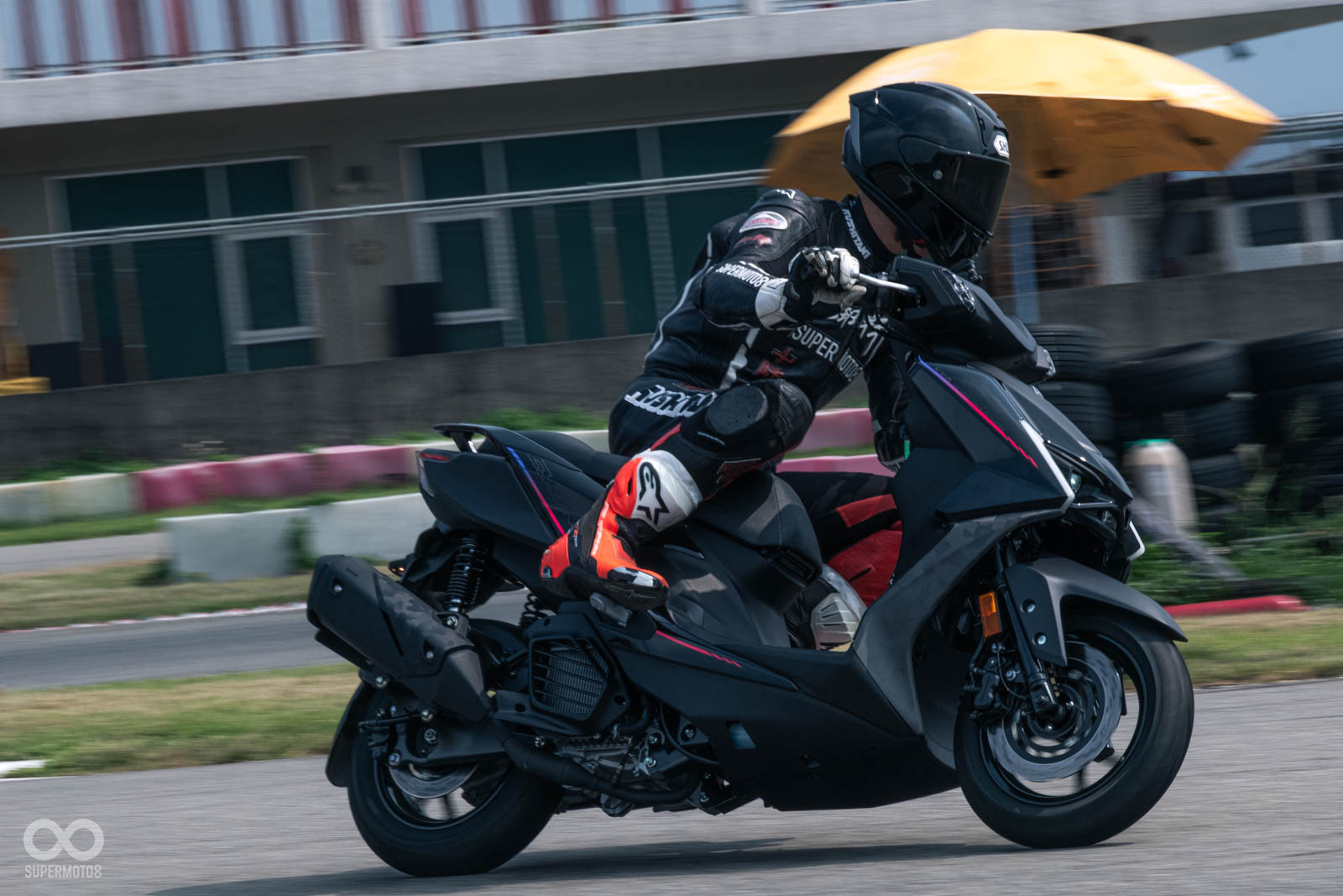 懸吊設定方面,七代依舊保有靈活的自由度,與 SYM JET 那種銳利的前倒角設定不同,Yamaha 更著重於靈巧轉向與穩定感兼顧。前懸吊在賽道上能提供豐富的路感回饋,雖然在高速下會稍微多一點雜訊,但整體可控性依舊良好。本次改款的另一個重點在於車架剛性,搭配升級到 2.5J、110/70-12 的前輪組,讓轉向反應更俐落。在與六代相比時,七代明顯改善了懸吊與車架配合不足的狀況。六代在激烈操駕下容易有「車尾過頂」的感覺,重煞時後輪回饋偏少;七代則能在出彎補油時讓後避震沉下,進而提供更完整的輪胎回饋,讓人更能掌握車輛極限。