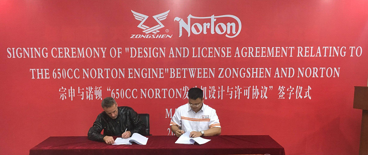 英國百年車廠Norton月初正式與中國摩托車製造商宗申簽署技術合作協定,承諾為宗申集團提供一具全新設計的650c.c.並列雙缸引擎,引擎由Norton開發,日後也將在英國Sussex生產製造,而宗申則是買斷了其20年使用權。