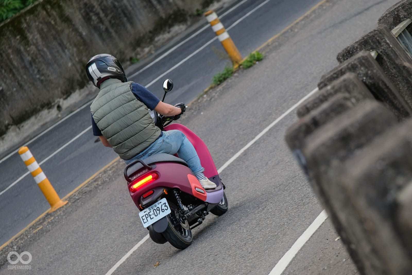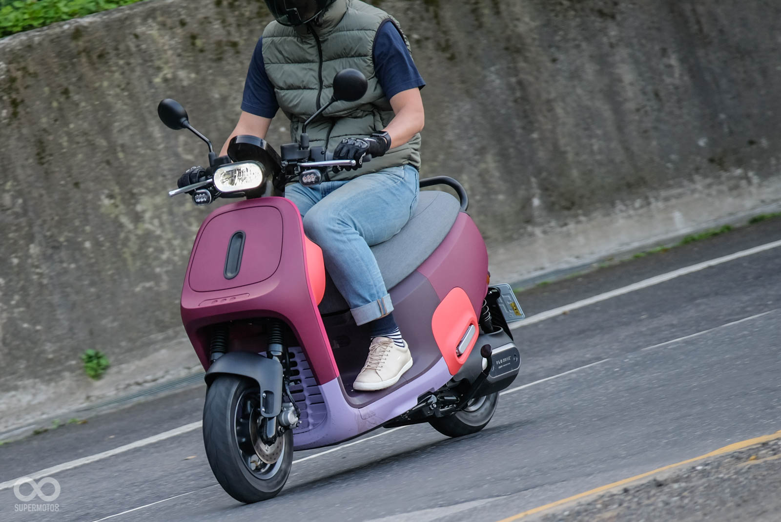 車殼材質維持近幾年Gogoro常見的PP材質,本次為了強調MIX風格,所以可在車側看到色塊拼接質感混搭風,車尾是我最喜歡的部份,車尾燈與車殼使用層次感呈現,給人一種用心設計的感覺,稍微提升車輛高級感。
